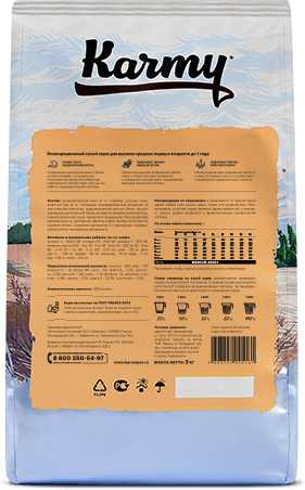 | Дополнительная информация : | рекомендуется переводить собаку на корм Karmy постепенно, в течение 5 дней увеличивайте долю Karmy в привычном рационе вашего питомца так пищеварительная система адаптируется к изменению корма |