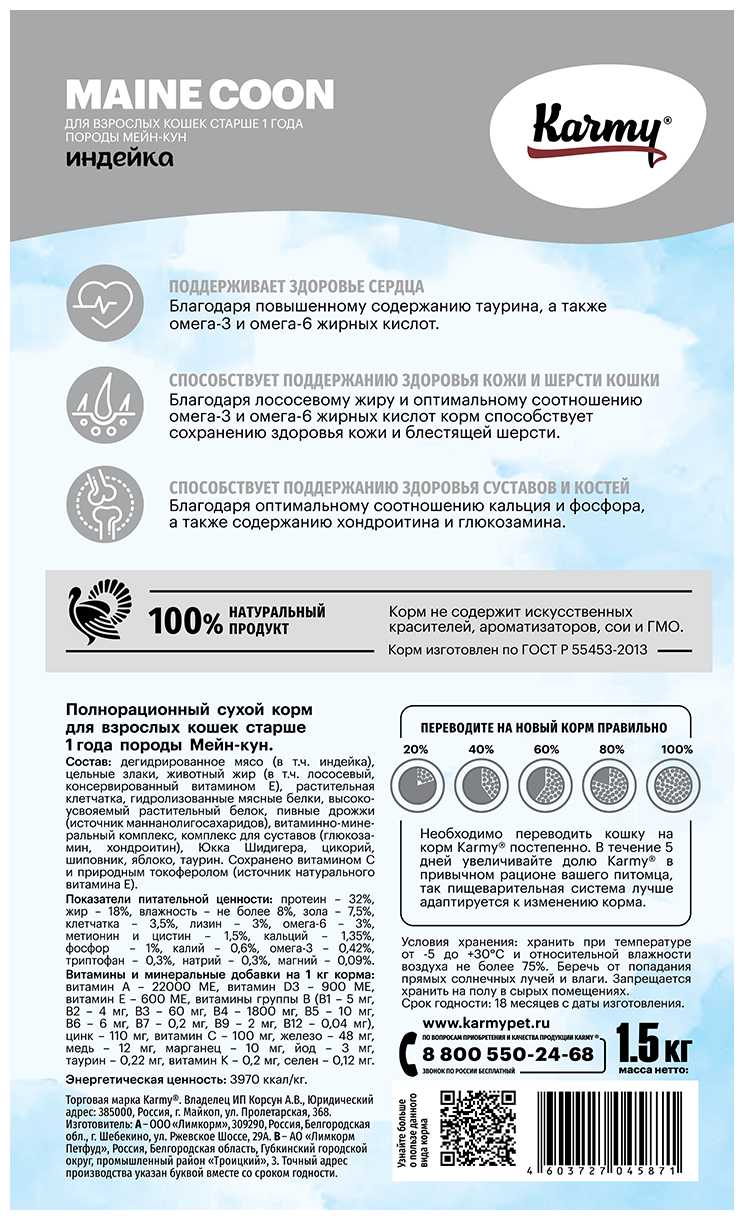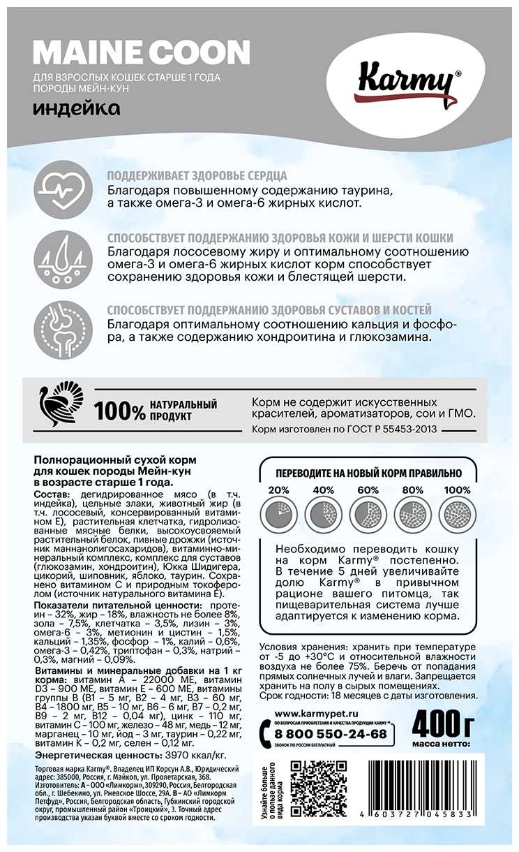 Отзывы о Корм для кошек Karmy Maine Coon (индейка)