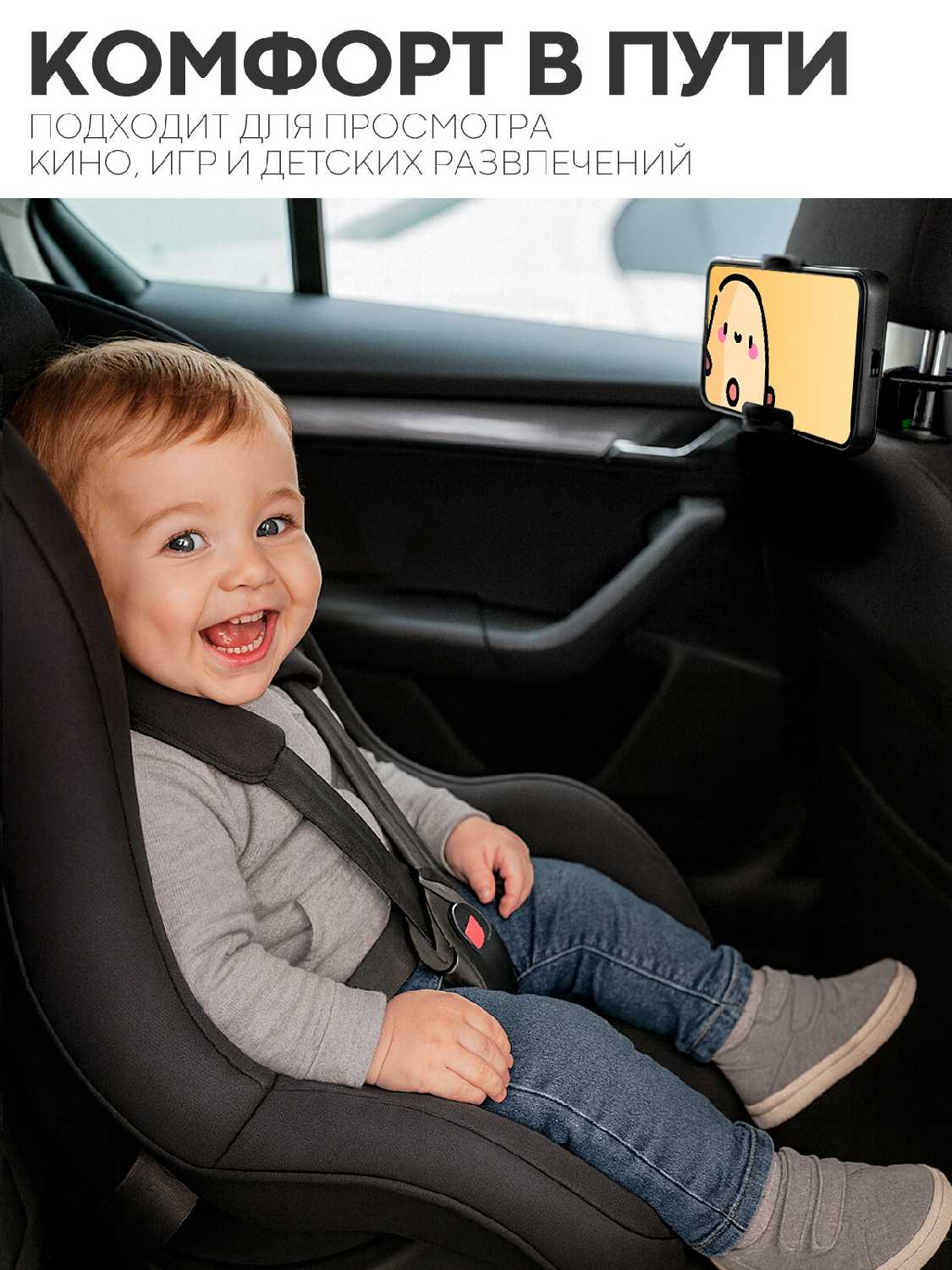 - + Просто и функционально. Угол наклона регулируется. Крепется на одном штыре подголовника, что позволяет его крутить в разные стороны. Это удобно например, закрепив на подголовнике со стороны водителя, можно выбирать необходимые мультфильмы и после повернуть телефон в сторону ребенка.