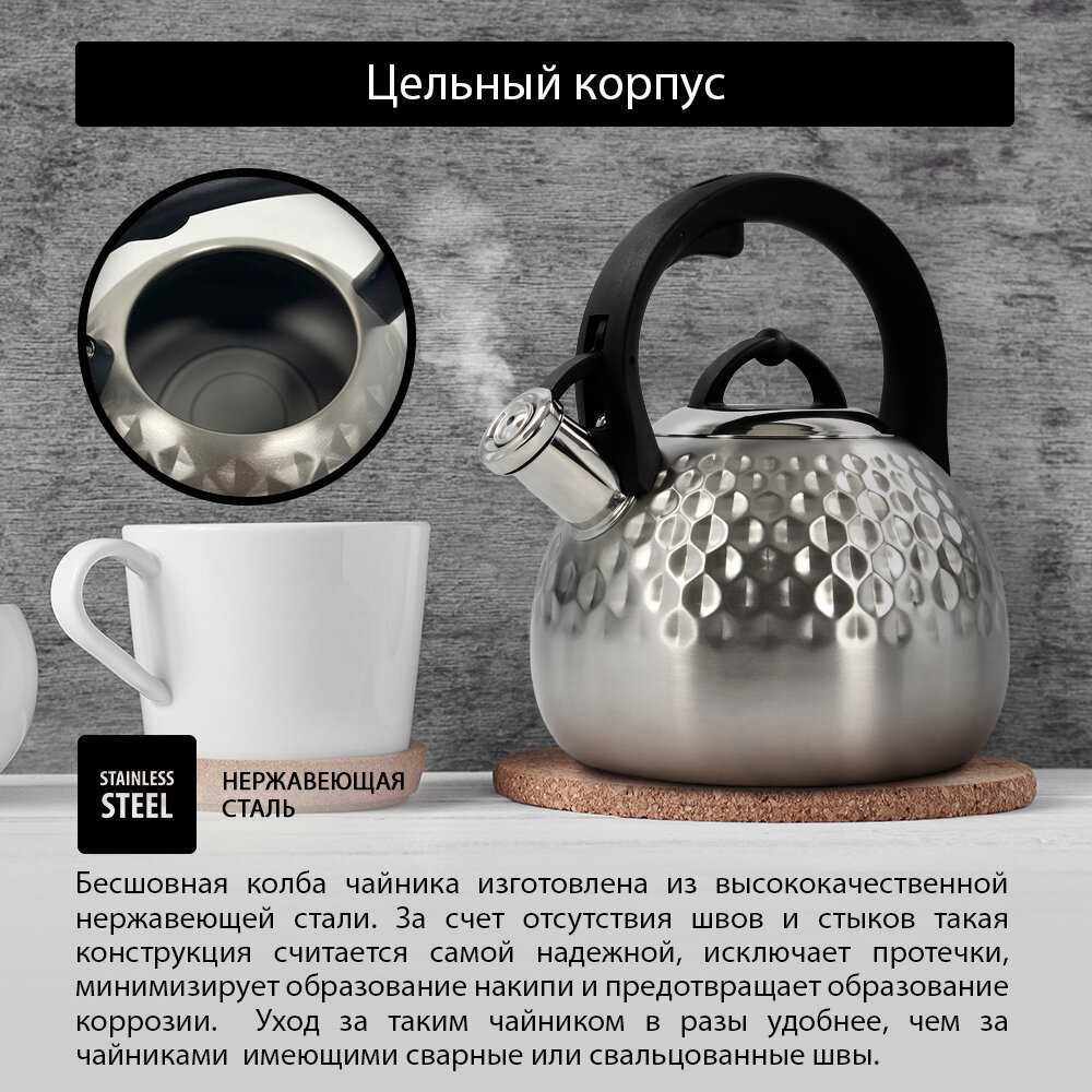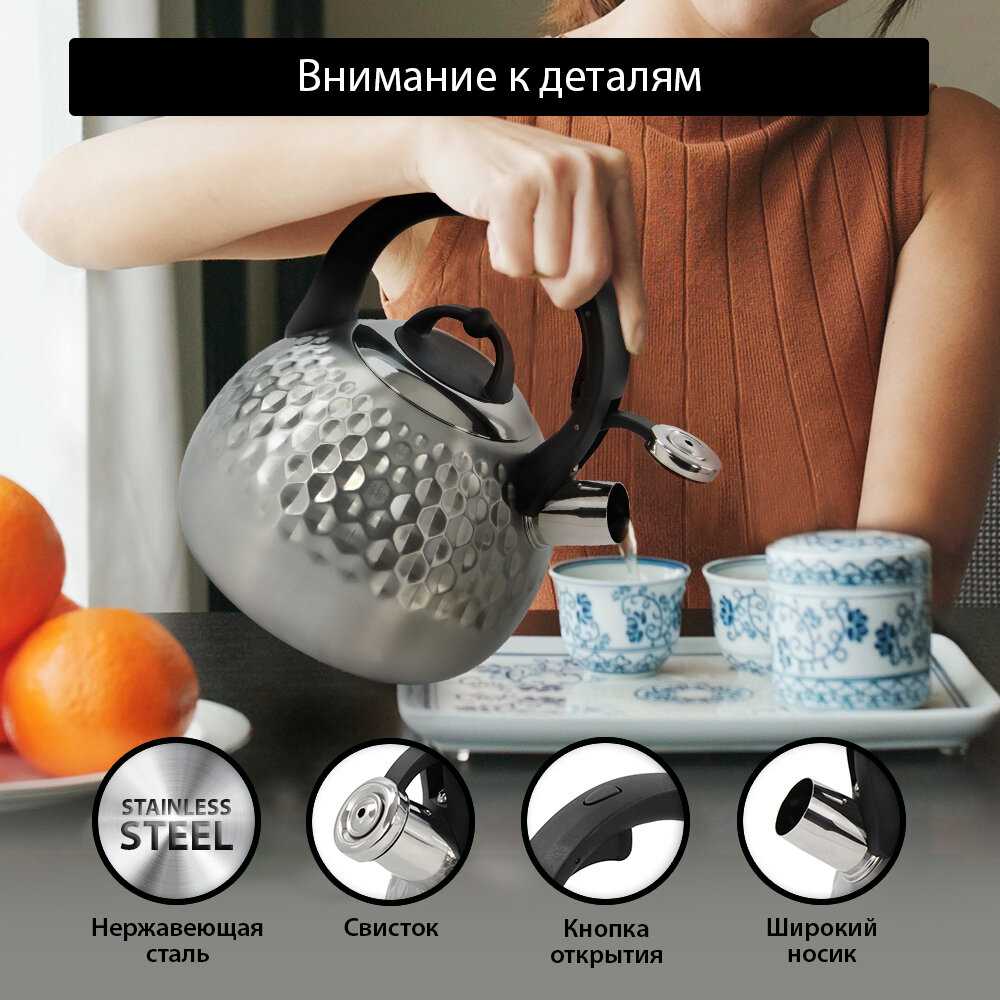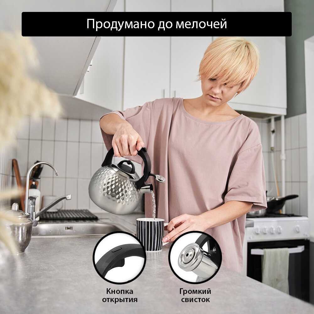 Свисток громкий, он не даст забыть о том, что поставил чайник греться. А при закипании водой не плюётся, даже если уровень воды доходит до носика чайника.