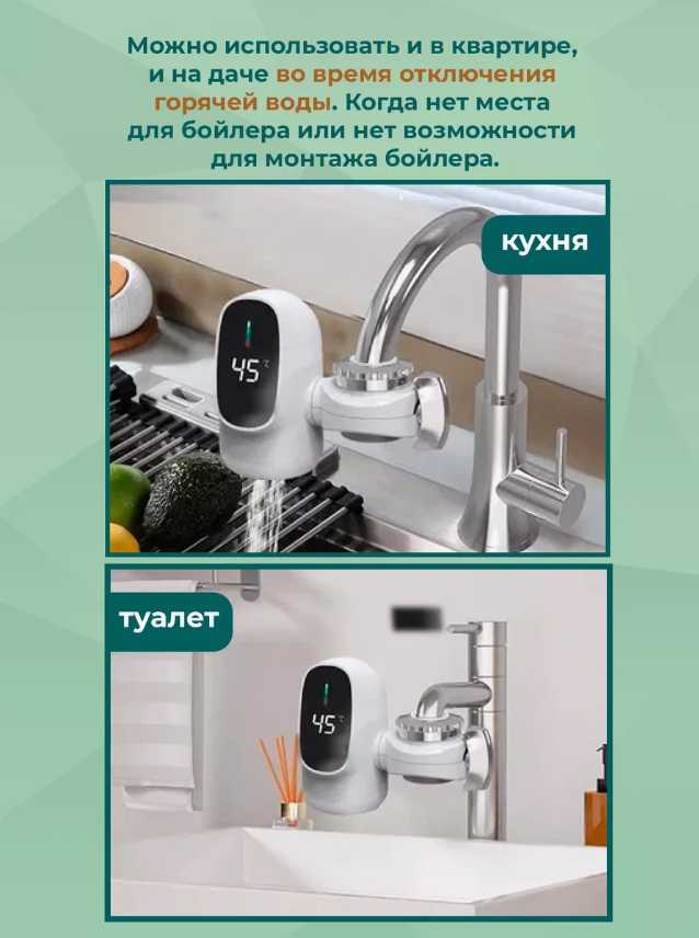 На кухне прибор часто используется успешно для мытья посуды теплой водой при отключениях ГВС. Переходники подходят к некоторым кухонным смесителям, нагрев достаточен для этой задачи. Пользователи отмечают удобство в компактном исполнении. Однако при сильном напоре струя тонкая и нагрев слабый. Идеально для временного решения на кухне. -