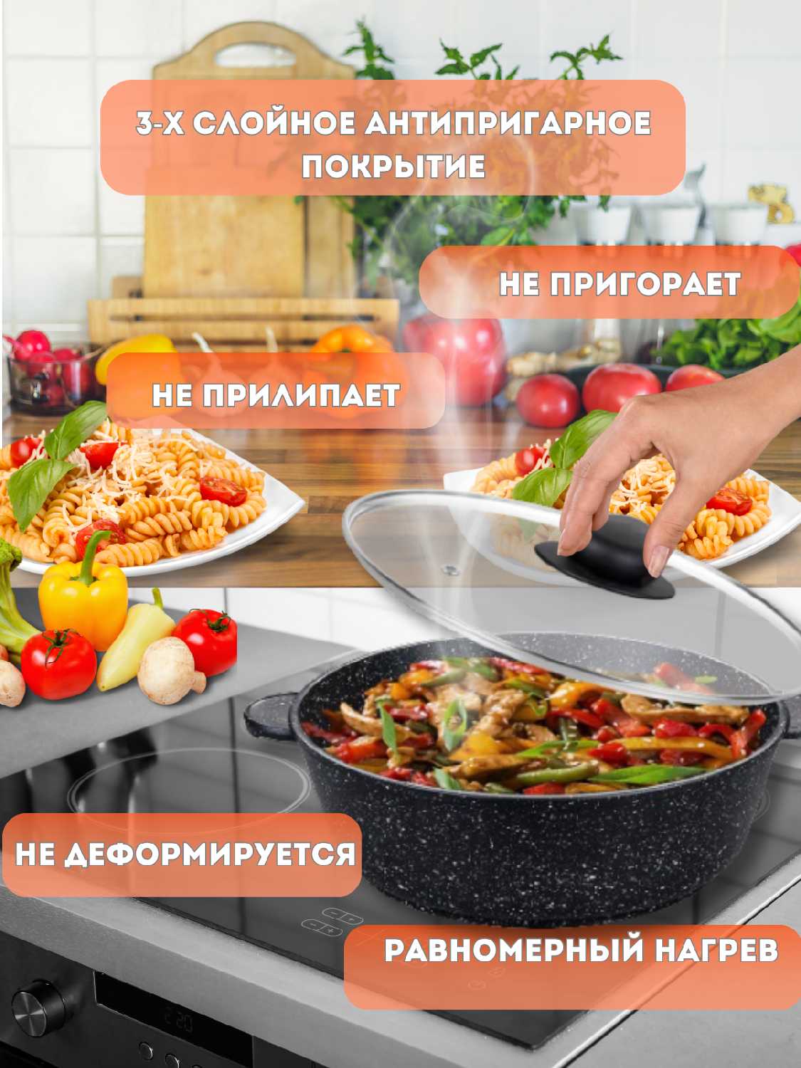 Характеристики:- Тип антипригарного покрытия: мраморное