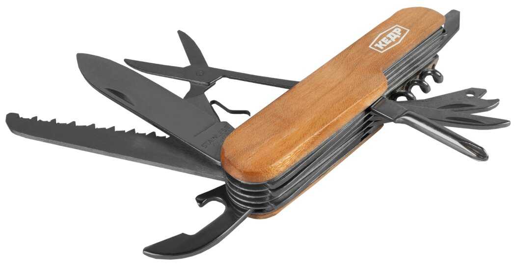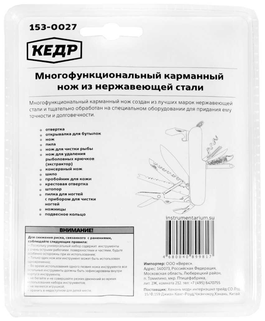 | Дополнительная информация : | комплектация: отвертка, открывалка для бутылок, нож, пила, рыбочистка, съемник рыболовных крючков, консервный нож, шило, пробойник для кожи, крестовая отвертка, штопор, пилка для ногтей, ножницы |