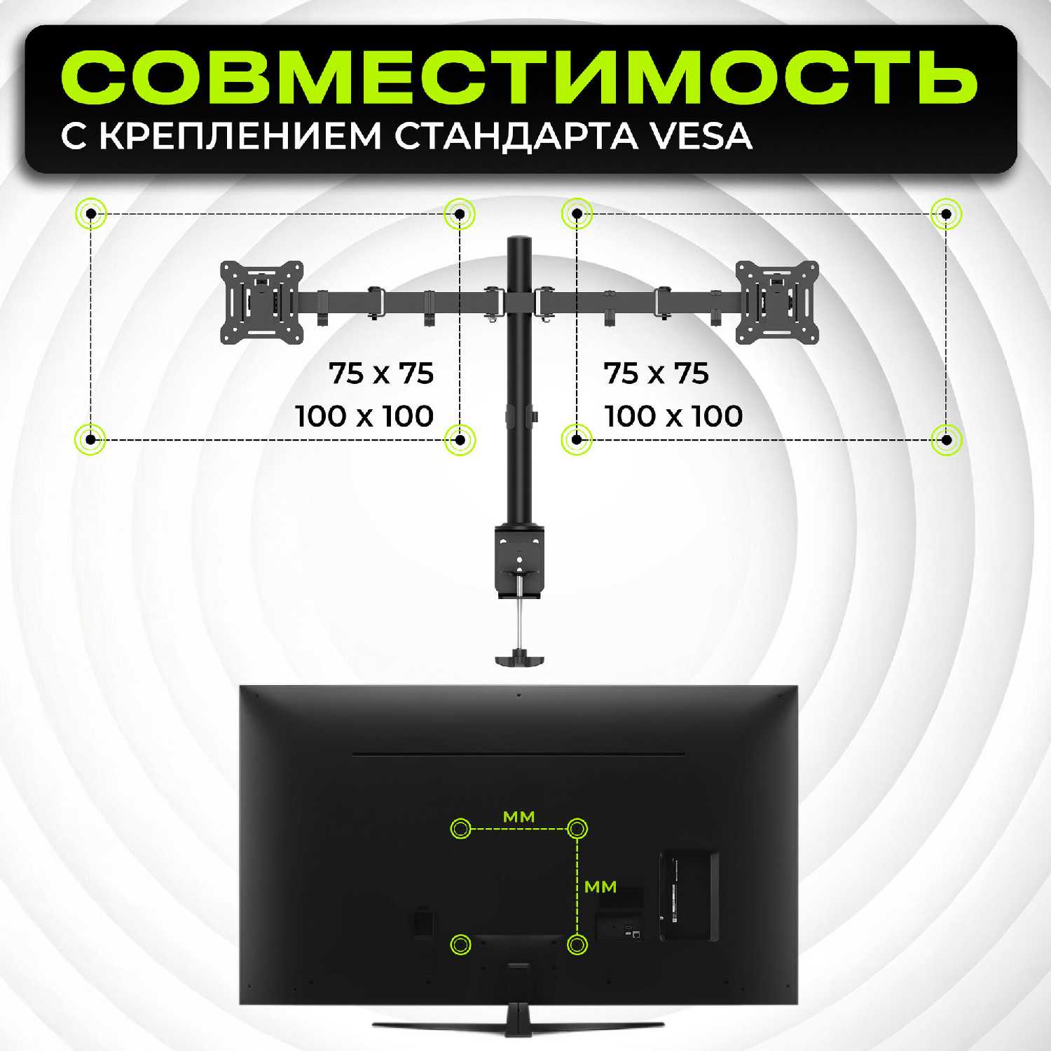 Крепёжные пластины поддерживают VESA 75x75 и 100x100 мм, что покрывает большинство современных мониторов. Однако глубоко утопленные разъёмы на некоторых моделях (например, Xiaomi Redmi G24) могут потребовать переходников. Перед покупкой стоит проверить расположение креплений на мониторе, чтобы избежать необходимости докупать адаптеры. -