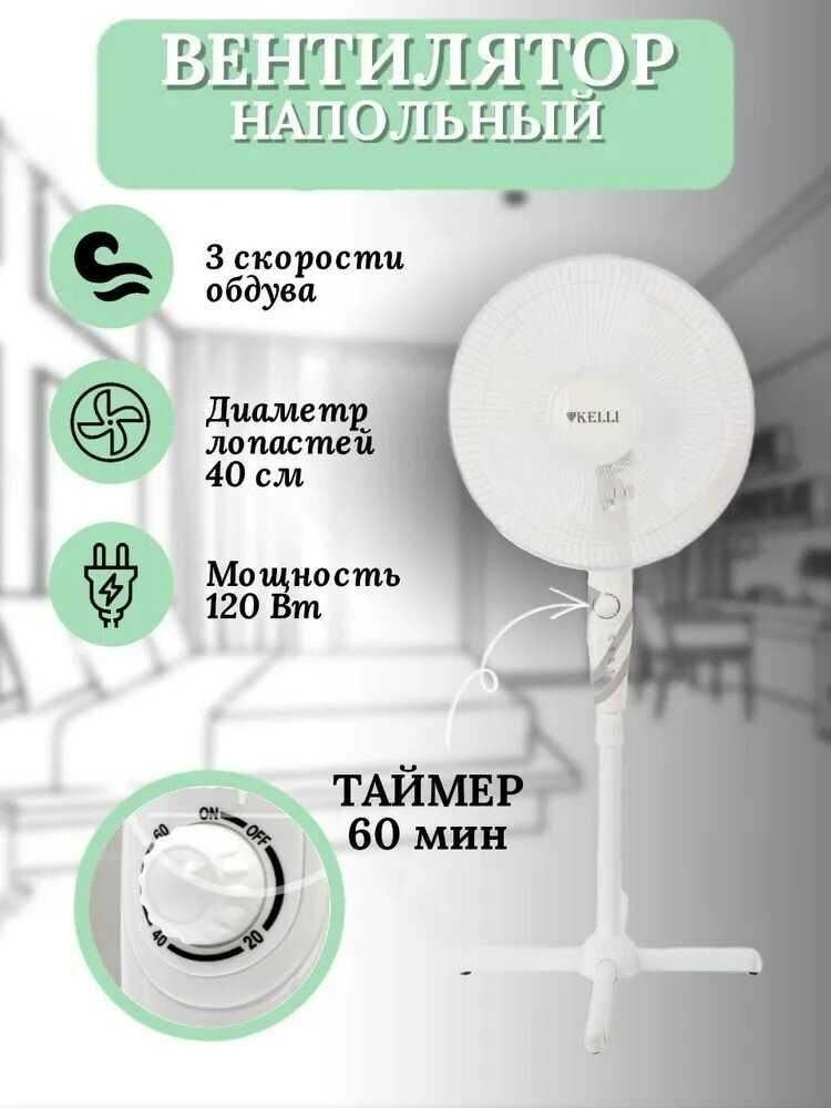Характеристи Kelli Напольный вентилятор [120W, 3 скорости, таймер]