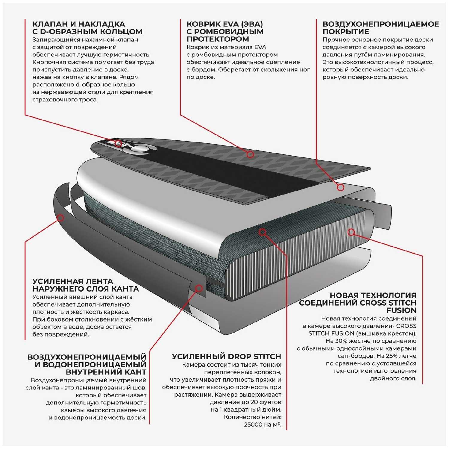 | Дополнительная информация : | новая технология соединений в камере высокого давления — CROSS STITCH FUSION (вышивка крестом). В результате камера на 30 % жёстче по сравнению с обычными однослойными камерами сап-бордов. И на 25 % легче камер с устоявшейся технологией изготовления двойного слоя |