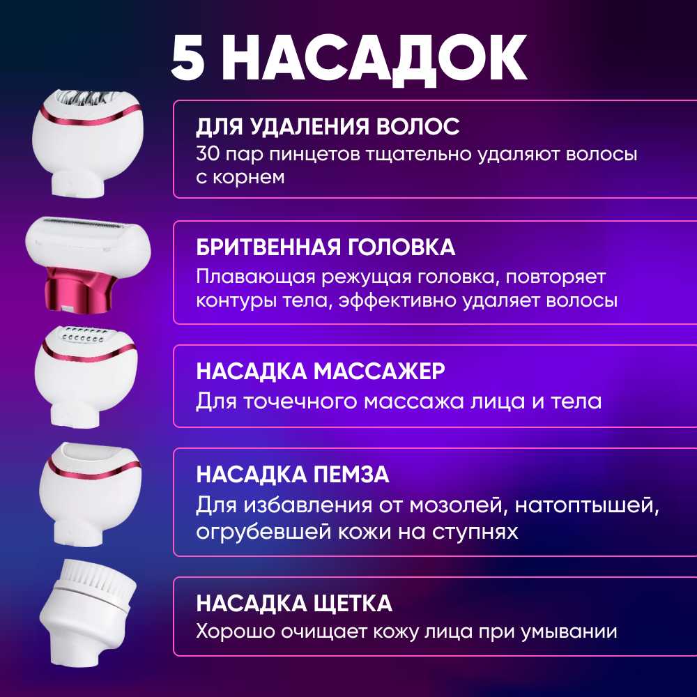 | Насадки : | для бритья, для педикюра, для пилинга, для точечного удаления волос, насадка для деликатных зон, насадка-триммер |