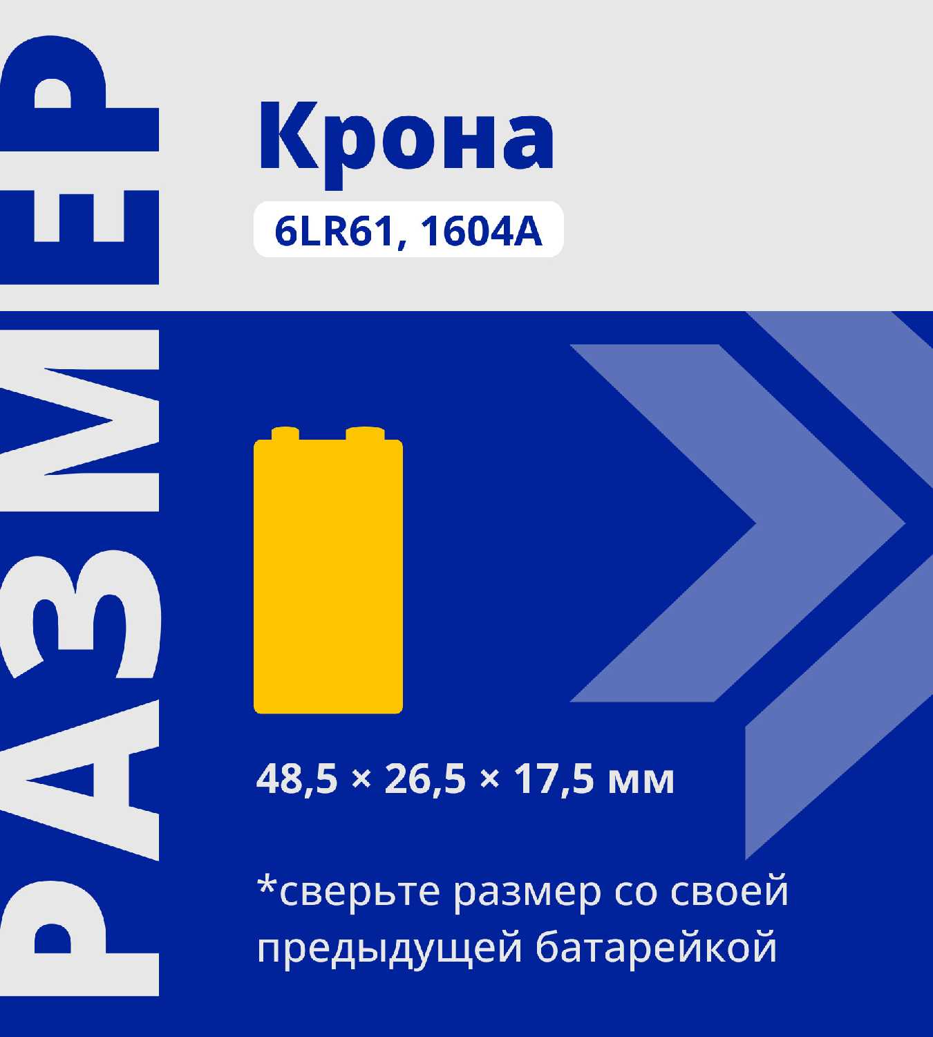 Типоразмер : | Крона (6LR61, 6LF22, 6KR61, 1604A) |