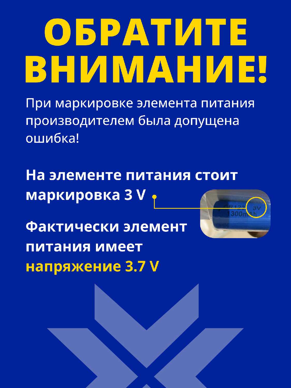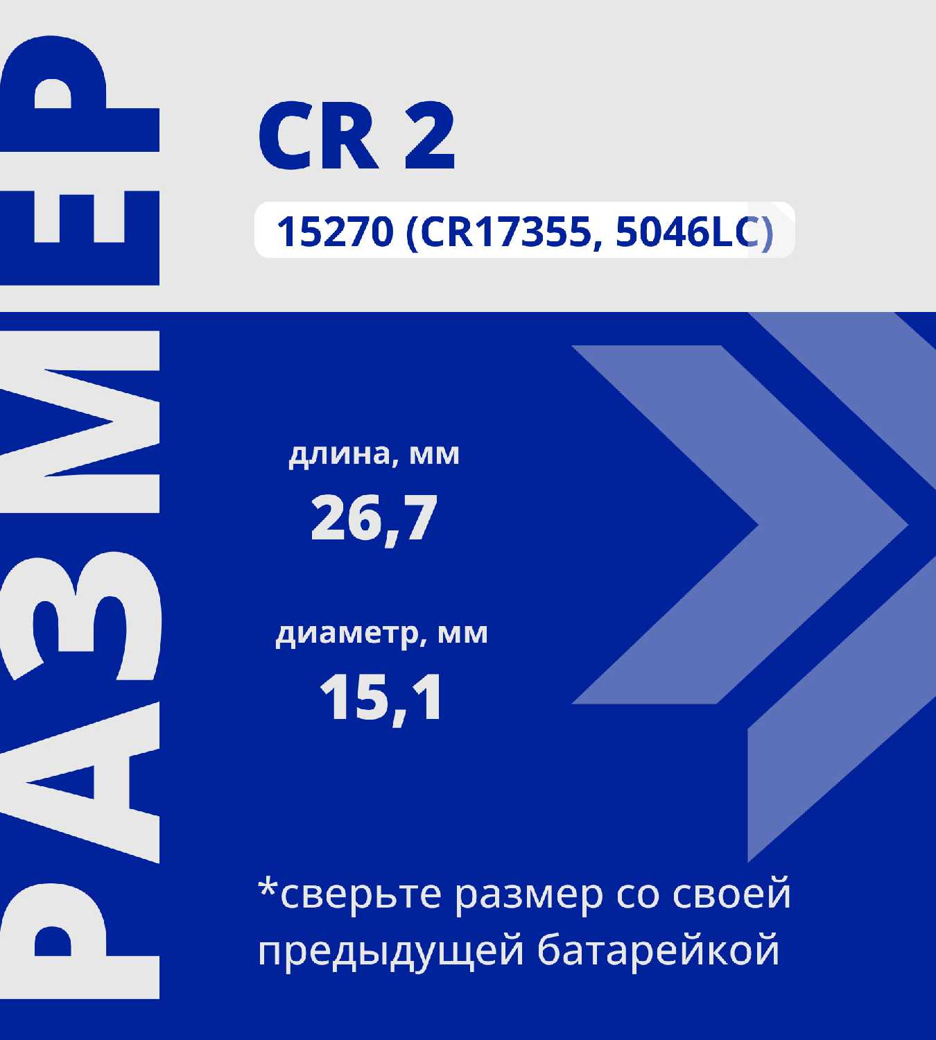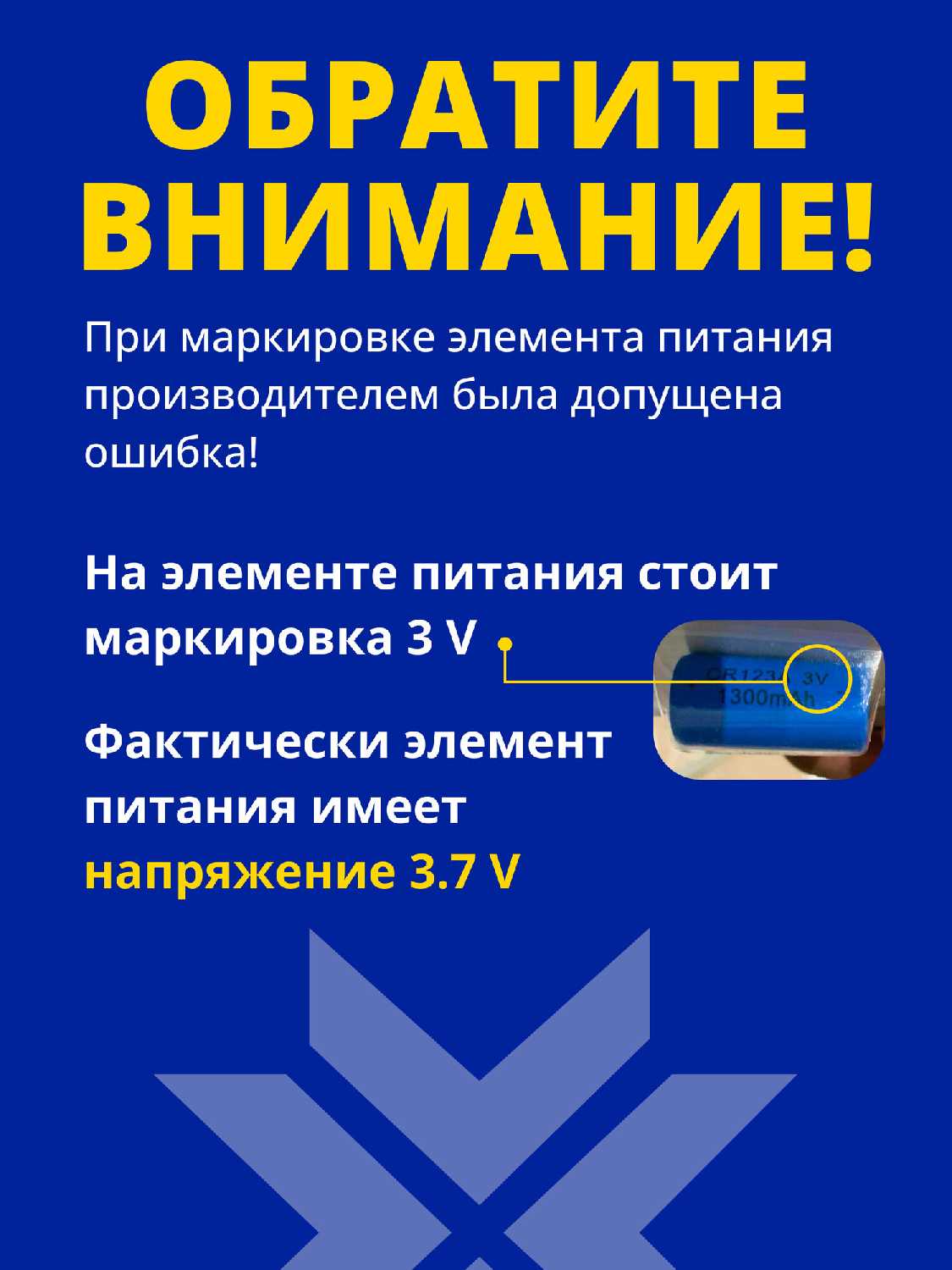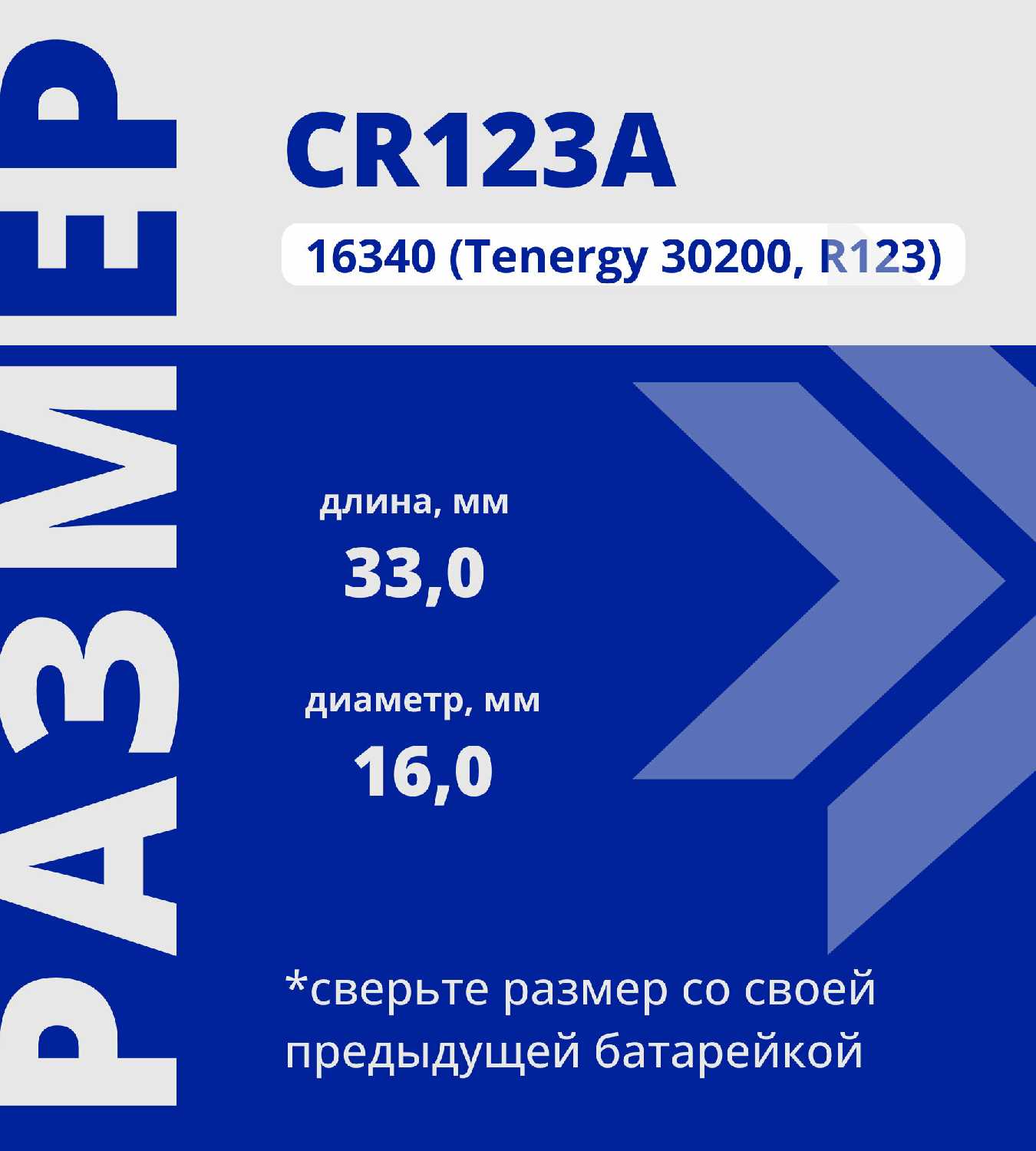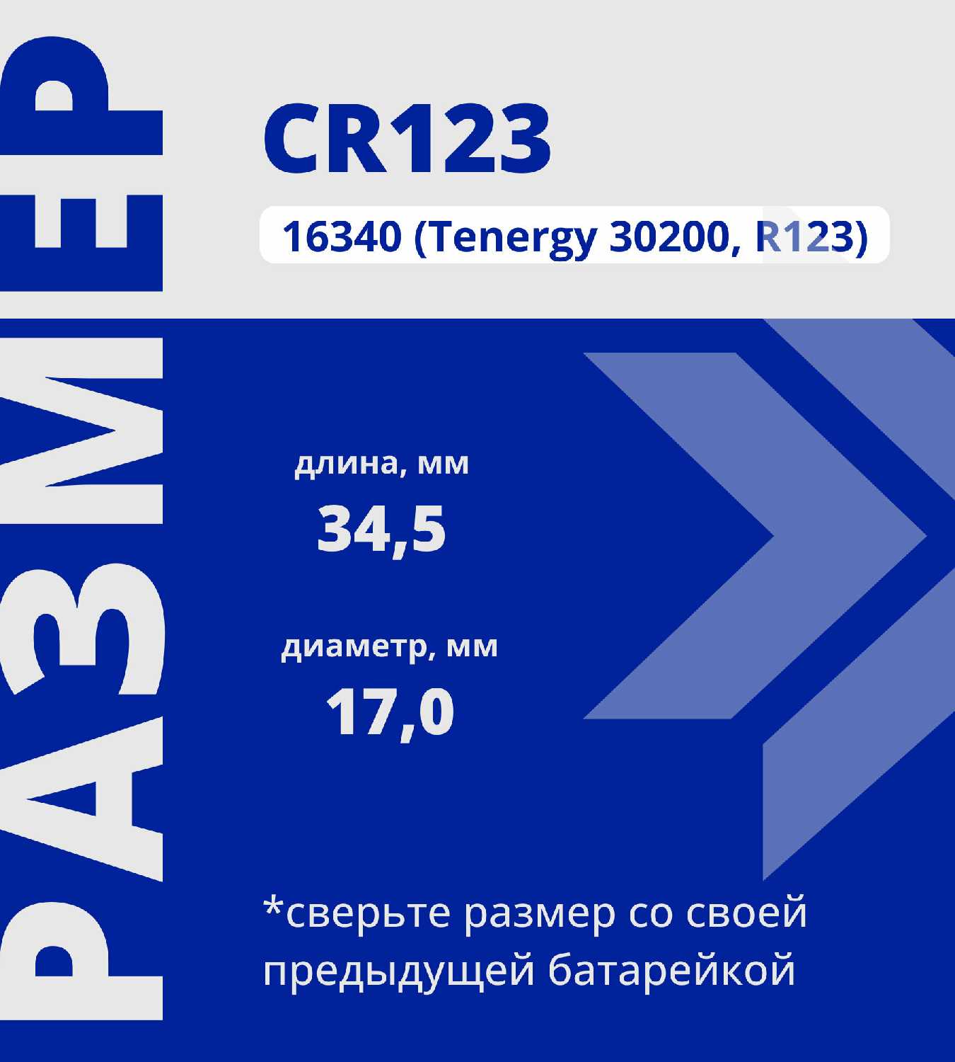 Типоразмер : | 16340 (Tenergy 30200, R123, RCR123A), CR123, СR2 (15270, CR17355, 5046LC) |
