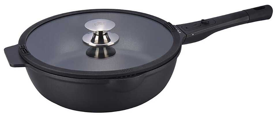 - + Сковорода то что надо. Размер, глубина – всё устраивает. Крышка сделана качественно, есть отверстия для выхода пара и ушки для слива. И главная ее особенность то что прочная и съёмная ручка – ну это для духовки очень важно.