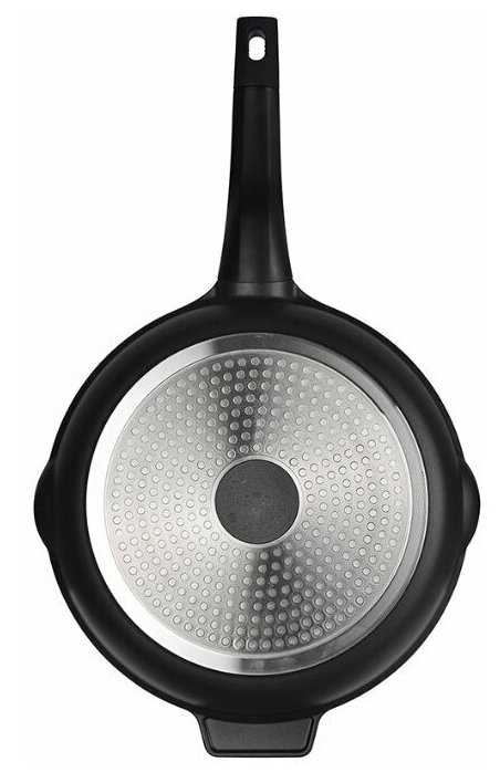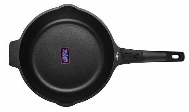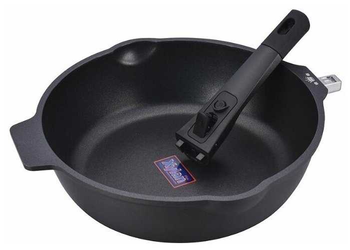 - + Замечательная сковорода. Большая. Сразу в комплекте с крышкой, у которой есть силиконовый ободок. Съемная ручка снимается легко. Очень удобно, что есть носики по бортикам для слива жидкости. Поверхность скользкая. Ничего не прилипает и не пригорает. Очень хорошо моется.