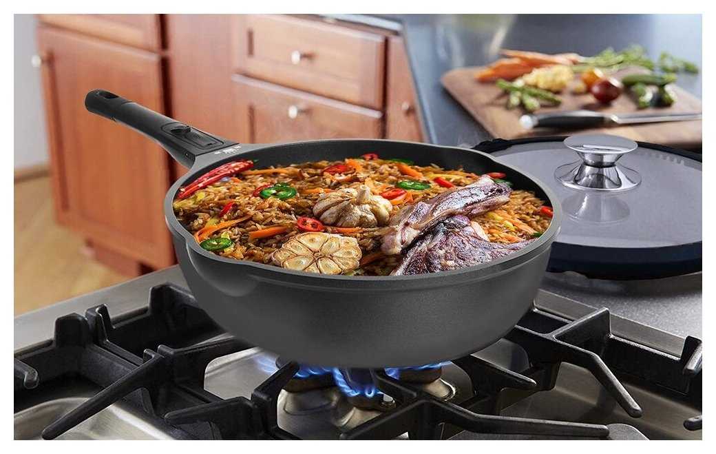 - + Чудная сковорода, хочу отметить особенность ее в том, что крышку можно использовать в духовке до 190 градусов, покрытие-чудо, ручка съемная.
