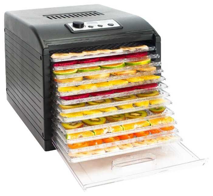 - 12 поддонов позволяют сушить большой объем продуктов за один раз, например, два больших пакета яблок или 6,5 баночек томатов.