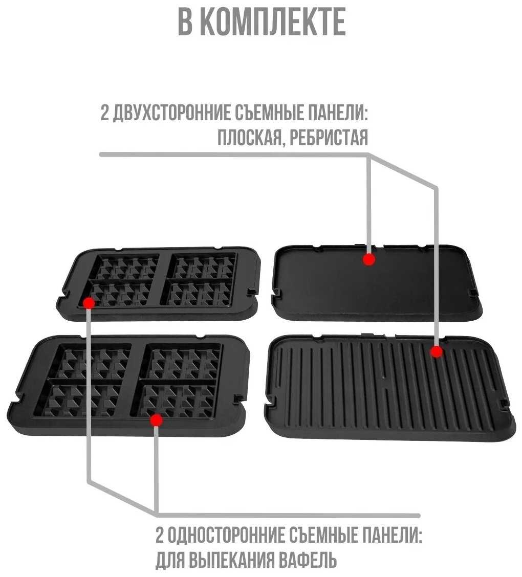 В комплекте идут четыре функциональные панели: две основные гриль-панели с двусторонним покрытием (рифленая и гладкая стороны на каждой), а также две отдельные панели специально для венских вафель. Пользователи подтверждают, что это позволяет готовить абсолютно разные блюда — от идеальных стейков и котлет до хрустящих вафель и сэндвичей. Двусторонность основных панелей многие сначала не замечали, но оценили этот бонус. -