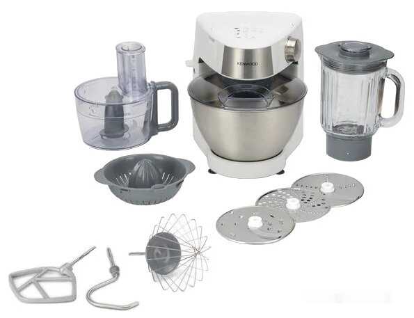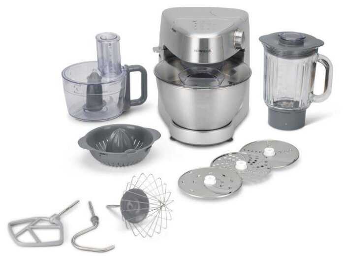 - Включает тестомес, венчики для взбивания, терку, измельчитель, блендер и соковыжималку, что позволяет готовить от салатов и супов до коктейлей и фарша.