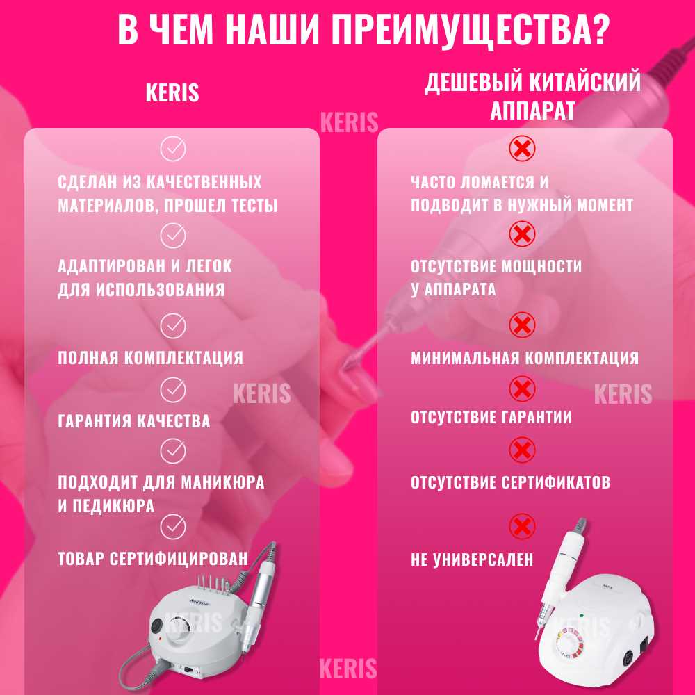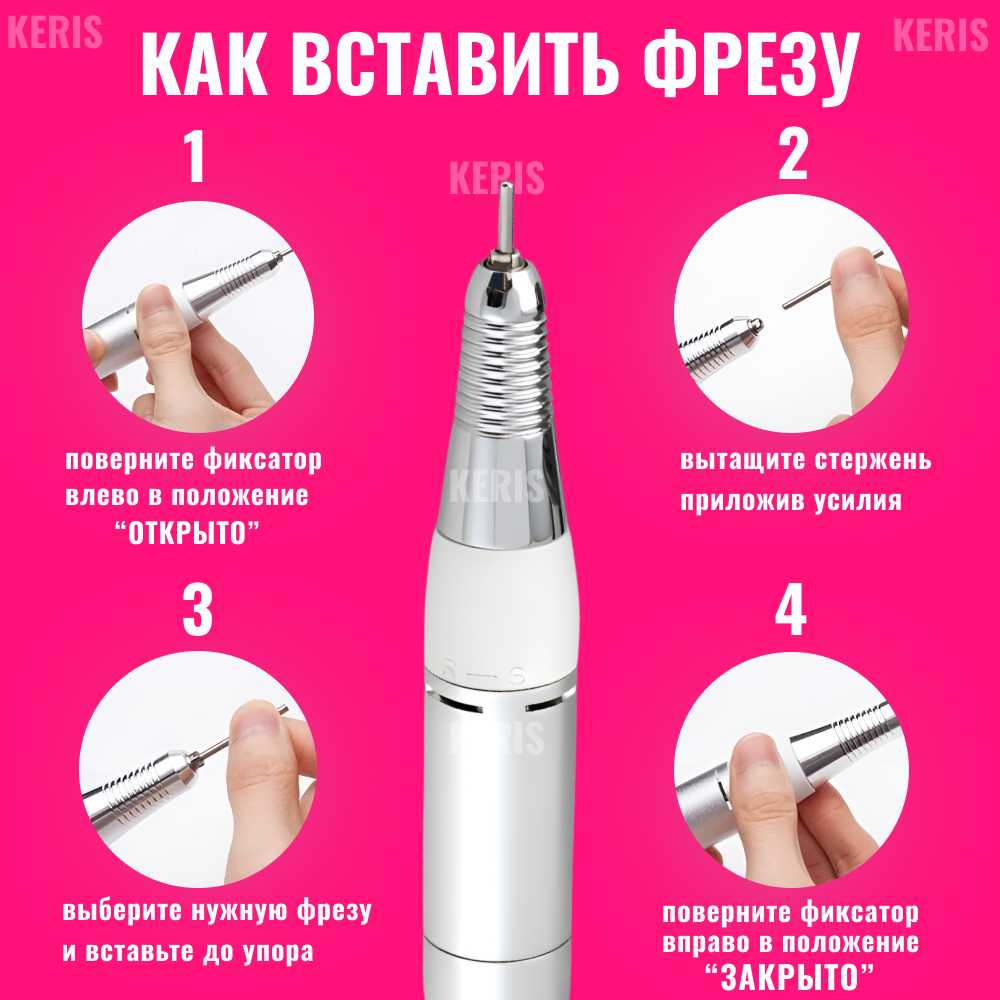 Дополнительная информация : | Включить аппарат в сеть, вставить фрезу в ручку аппарата, зажать её. обработать ногтевую пластину |