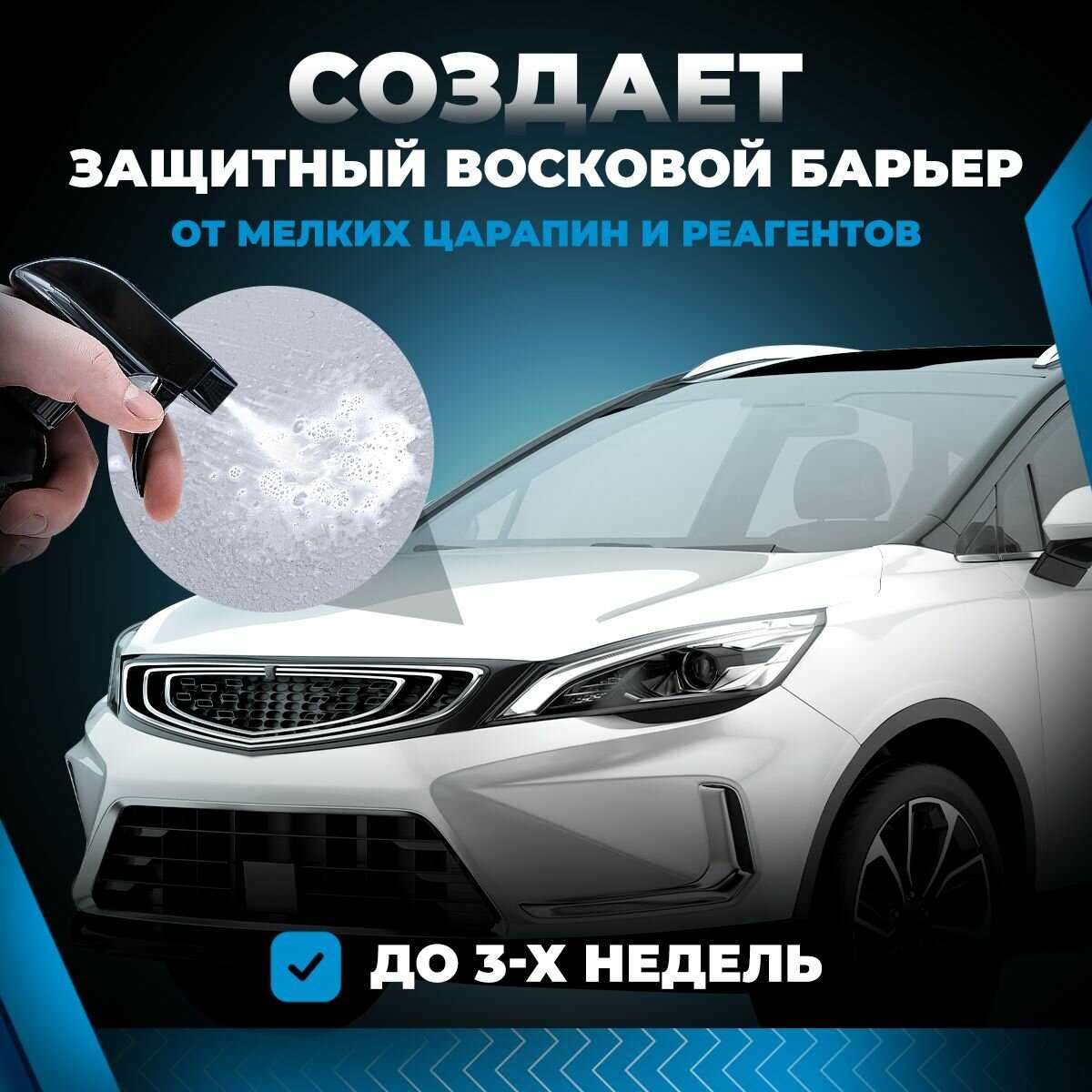 Состав формирует временный защитный слой, отталкивающий воду и грязь, что подтверждается снижением загрязнений после дождя. Однако пользователи уточняют, что этот эффект не долговечен и не заменяет специализированные защитные покрытия. Основная функция — очистка, а не длительная консервация ЛКП. -