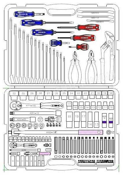 | Инструменты в комплекте : | бокорезы, вороток для головок, выколотка, длинногубцы, зубила, клещи, клещи переставные, ключ переставной гаечный, ключ разводной, ключи гаечные, ключи имбусовые (шестигранные), ключи торцевые, круглогубцы, кусачки, молоток, отвёртки, отвёртки для точных работ, пассатижи, плоскогубцы, разрезные ключи-насадки, рукоять для бит, рукоять для головок, трещотка, трубчатые ключи |