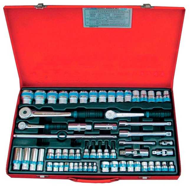 - + Практически все, что надо из размеров и типов головок, воротков и трещеток в одном ящике.
