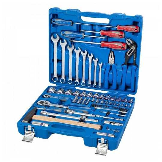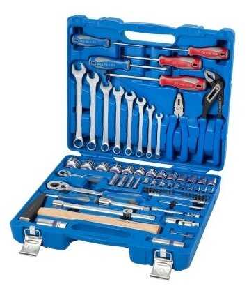 Инструменты в комплекте : | бокорезы, вороток для головок, клещи, клещи переставные, ключ разводной, ключи гаечные, ключи имбусовые (шестигранные), молоток, отвёртки, пассатижи, плоскогубцы, трещотка |