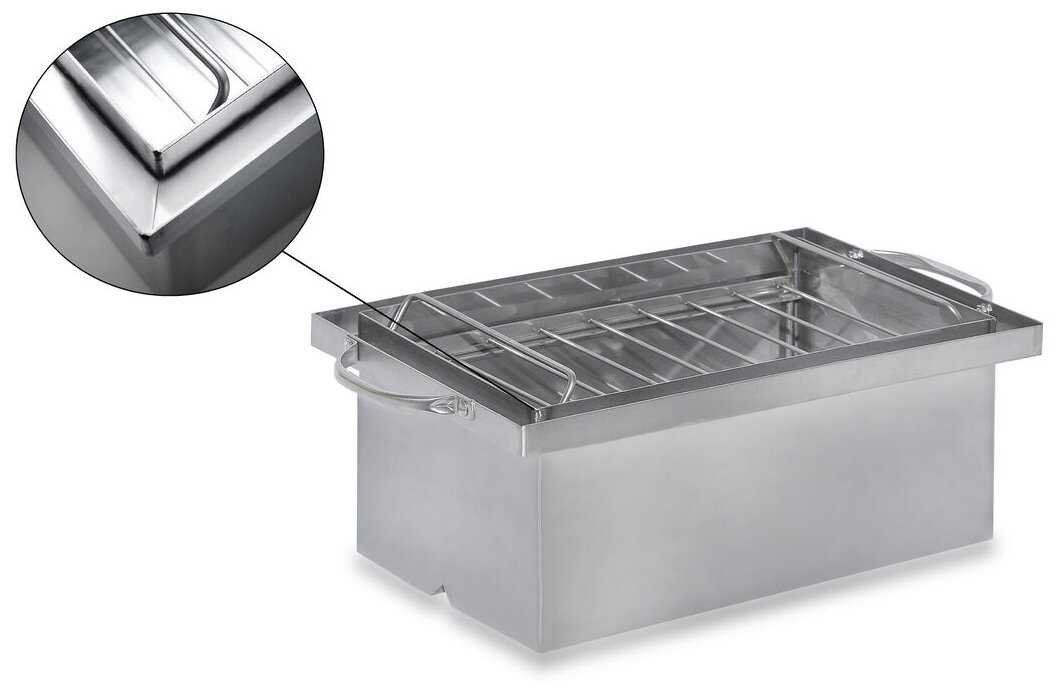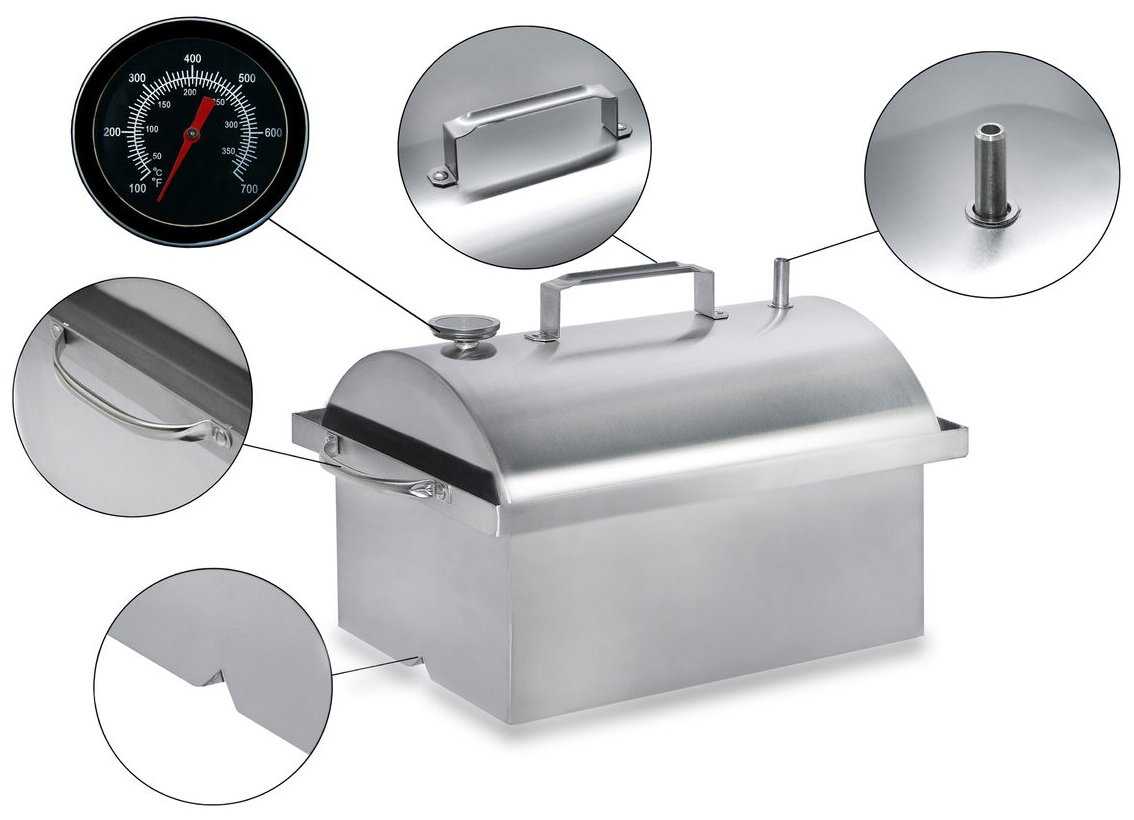 - + Коптильня выполнена из нержавеющей стали, размер как плюс так и минус, вроде компактный, но в тоже время чуть чуть бы со всех сторон добавить,. Купольная крышка