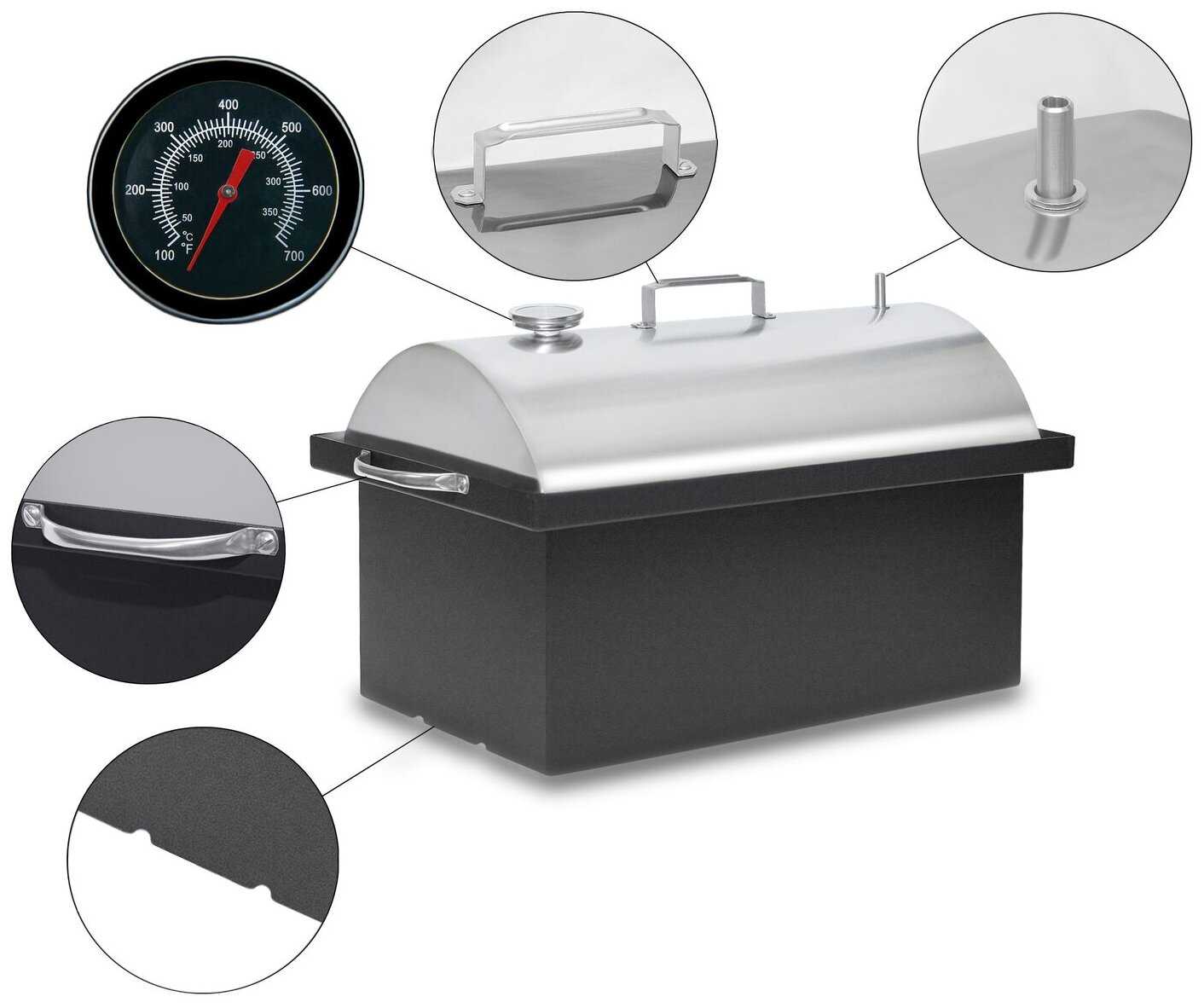 Особенности : | крышка, поддон для сбора жира, термометр |