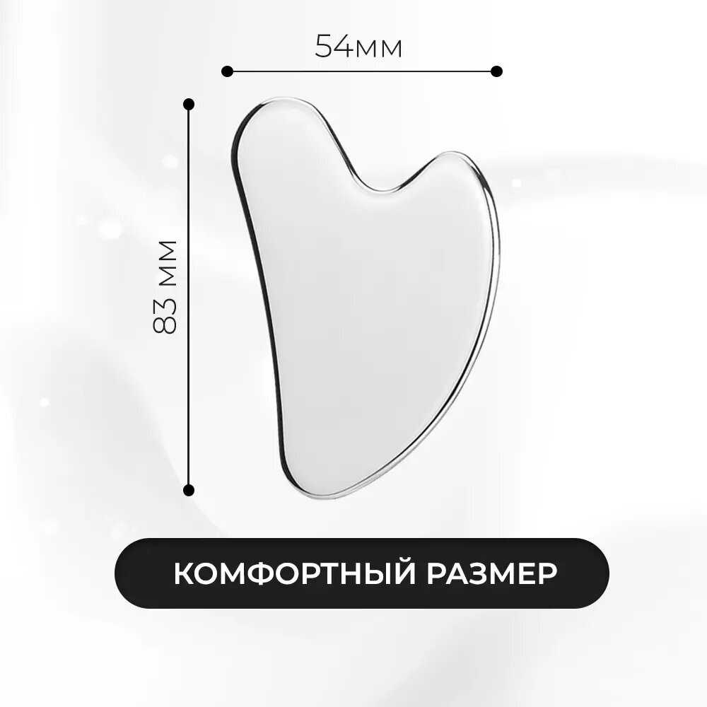 - + Форма и размеры позволяют легко и точно работать с различными зонами лица, шеи и декольте. Из-за того, что скребок металлический он приятно охлаждает кожу.