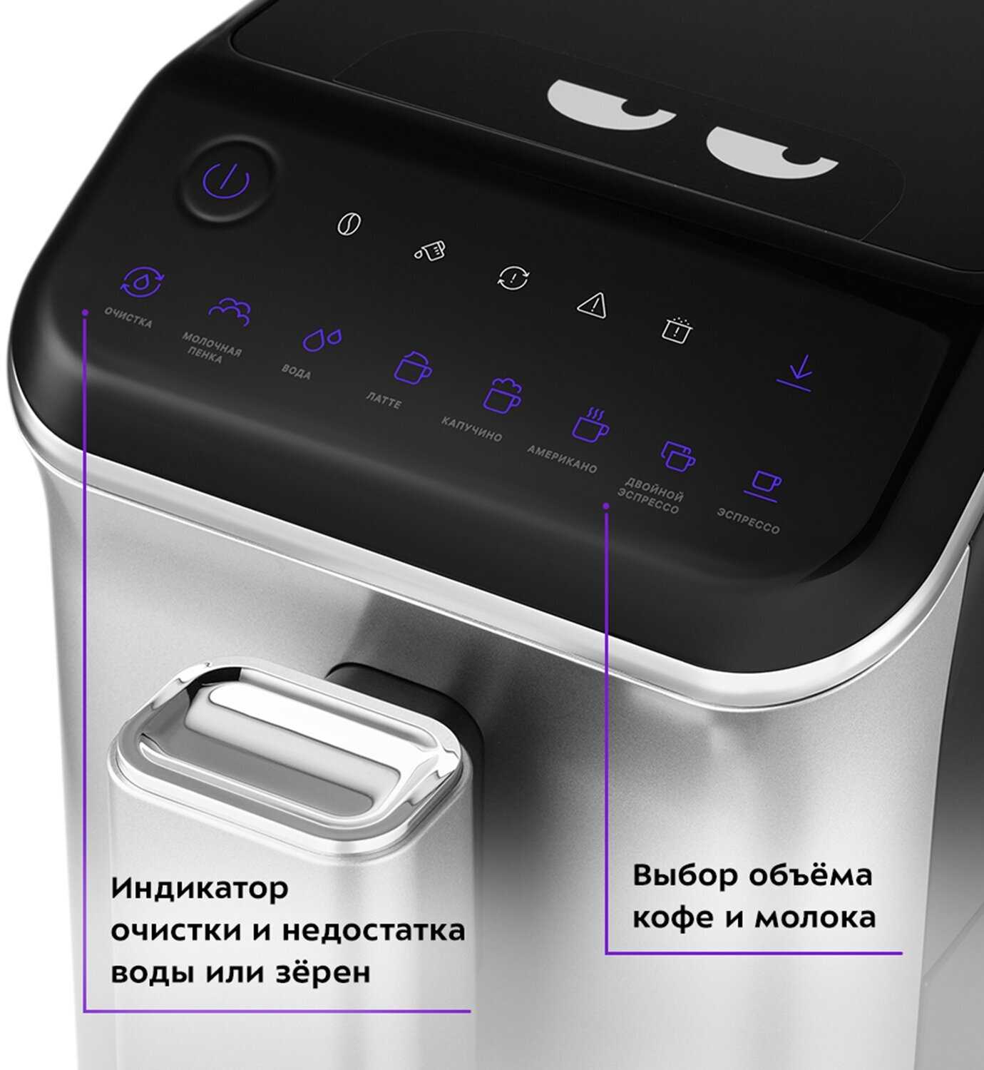 - Сенсорная панель с пиктограммами для 6 типов напитков (включая латте и горячее молоко).