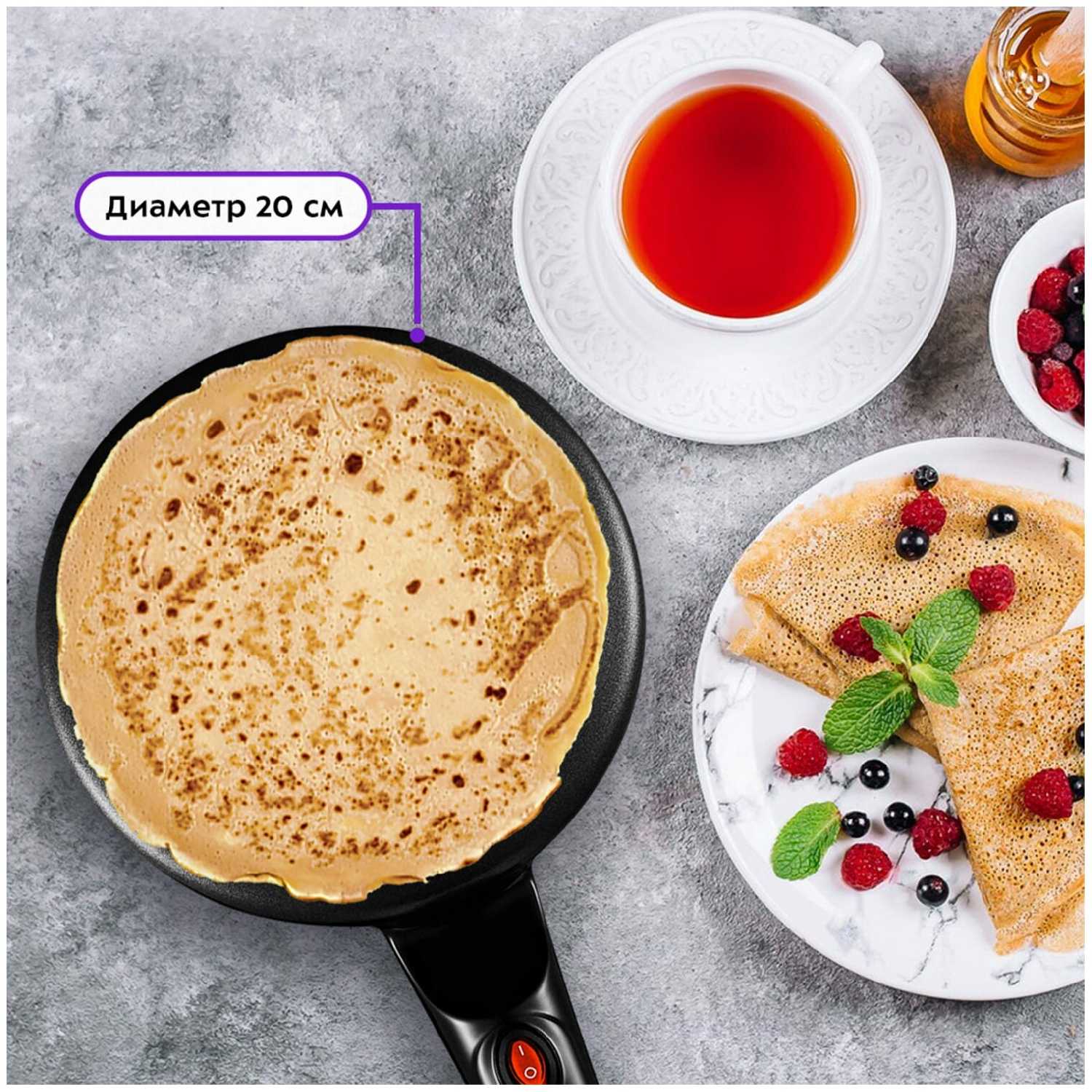 - Тефлоновое покрытие без масла предотвращает прилипание блинов, позволяя снимать их силиконовой лопаткой без повреждений и сохраняя форму продукта.