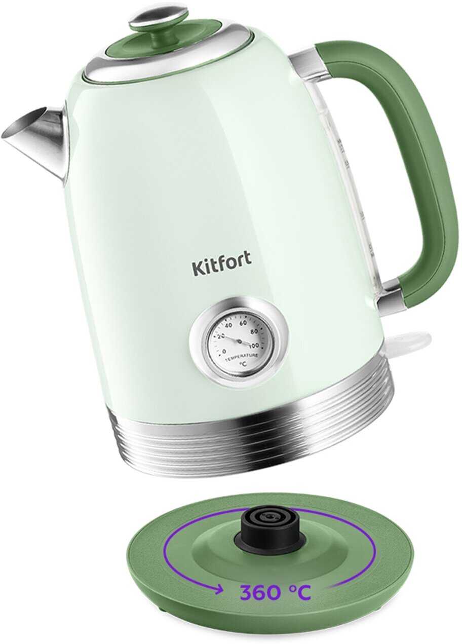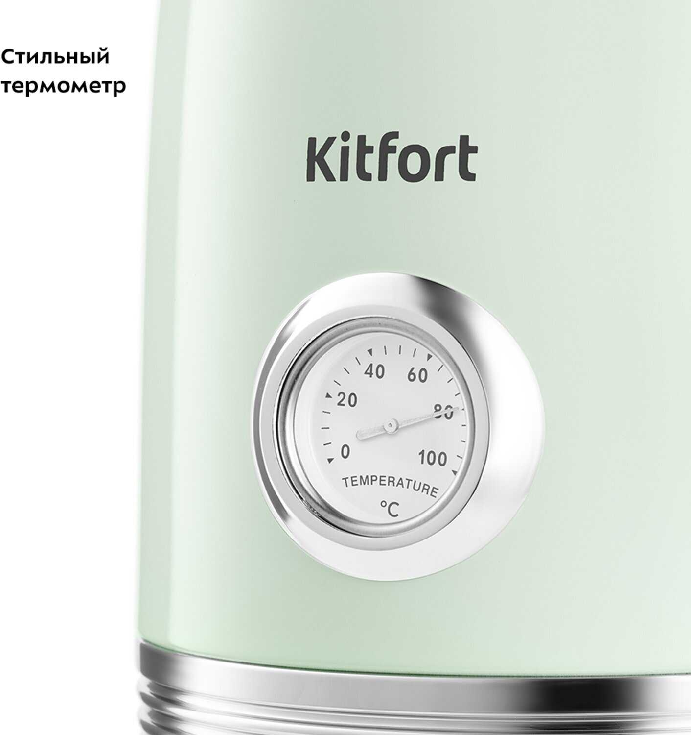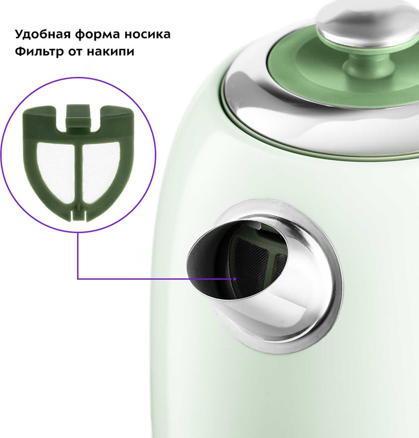 Ручка не нагревается даже при длительном кипячении, крышка полностью снимается для легкого наполнения и чистки, а носик оснащен фильтром, предотвращающим проливание. Дизайн в ретро-стиле с мятным оттенком и хромированными деталями получил высокие оценки за эстетику. -