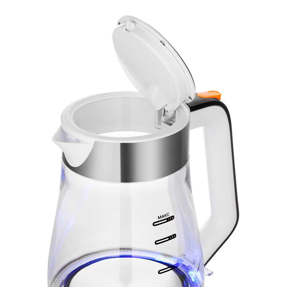 Конструкция, материалы сборки и эргономика: Чайник Kitfort KT-6626 обладает прозрачным корпусом из жаропрочного стекла с нанесенными мерными делениями, что позволяет визуально контролировать уровень воды без необходимости открывания крышки. Основание выполнено из нержавеющей стали, что полностью исключает появление ржавчины в отличие от моделей конкурентов, а нагревательный элемент скрыт, что упрощает уход. Ручка чайника комбинированная, сочетает белый пластик с черными вставками и желтой кнопкой механического открытия крышки, что пользователи отмечают как эргономичное и практичное решение. Крышка металлическая с пластиковым элементом для безопасного касания, открывается широко, обеспечивая удобное наполнение, но при резком наклоне во время наливания возможна незначительная протечка воды из-под её края. Подставка массивная, обладает вращением на 360 градусов для удобства установки и отсеком для сматывания избытка сетевого шнура, длина которого некоторыми пользователями оценена как недостаточная. Общий вес и устойчивость конструкции оцениваются высоко, сборка не имеет люфтов, посторонних скрипов. Носик выполнен из пластика, но его форма признана удачной, полностью исключающей подтекание первых капель кипятка на корпус, что было проблемой у предыдущих моделей пользователей. Выключатель расположен под ручкой, а не на ней, что, по мнению пользователей, может повысить его долговечность за счет защиты от перегрева, хотя его конструкция визуально воспринимается как менее надежная.