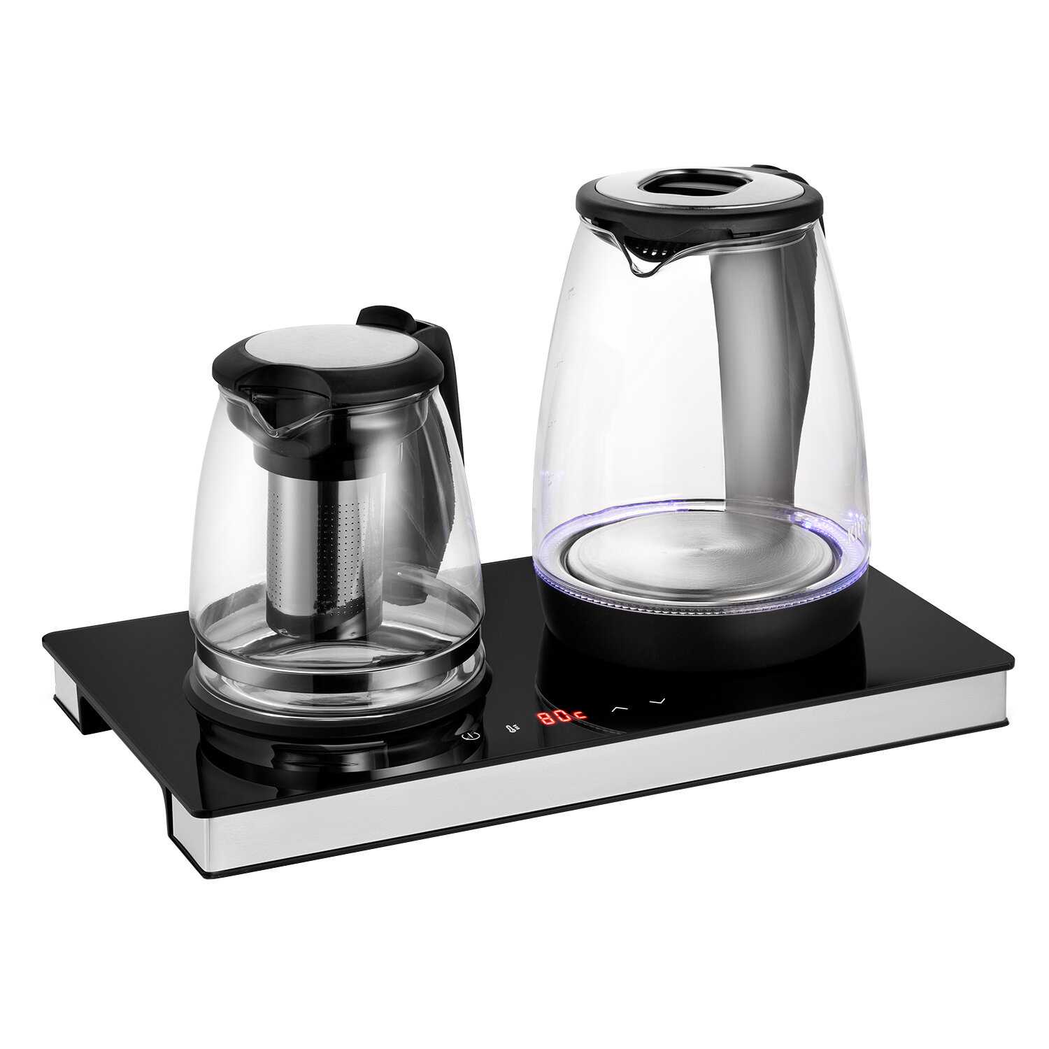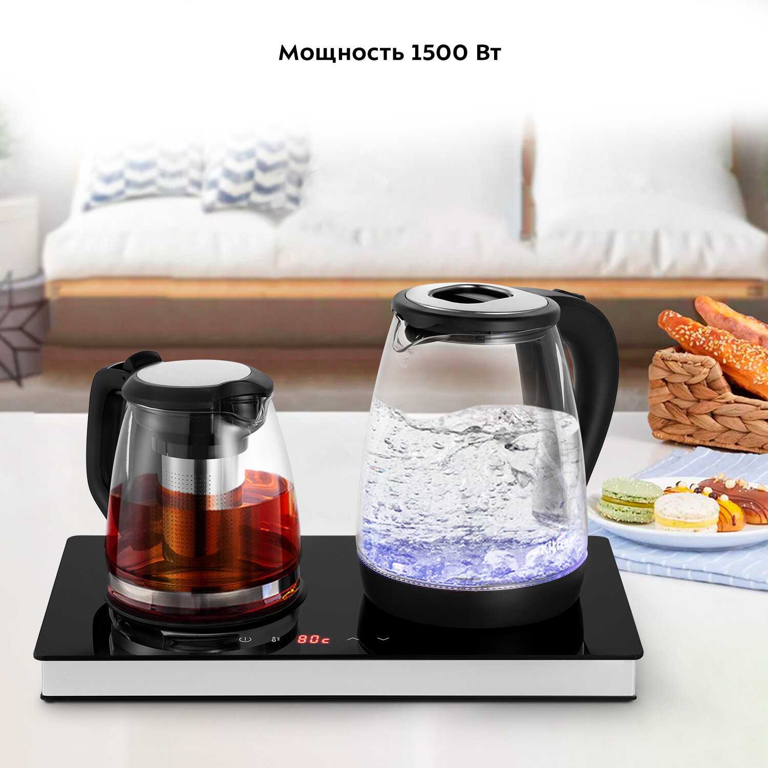 - База занимает минимум места (диаметр 22 см), объединяя чайник и заварник.