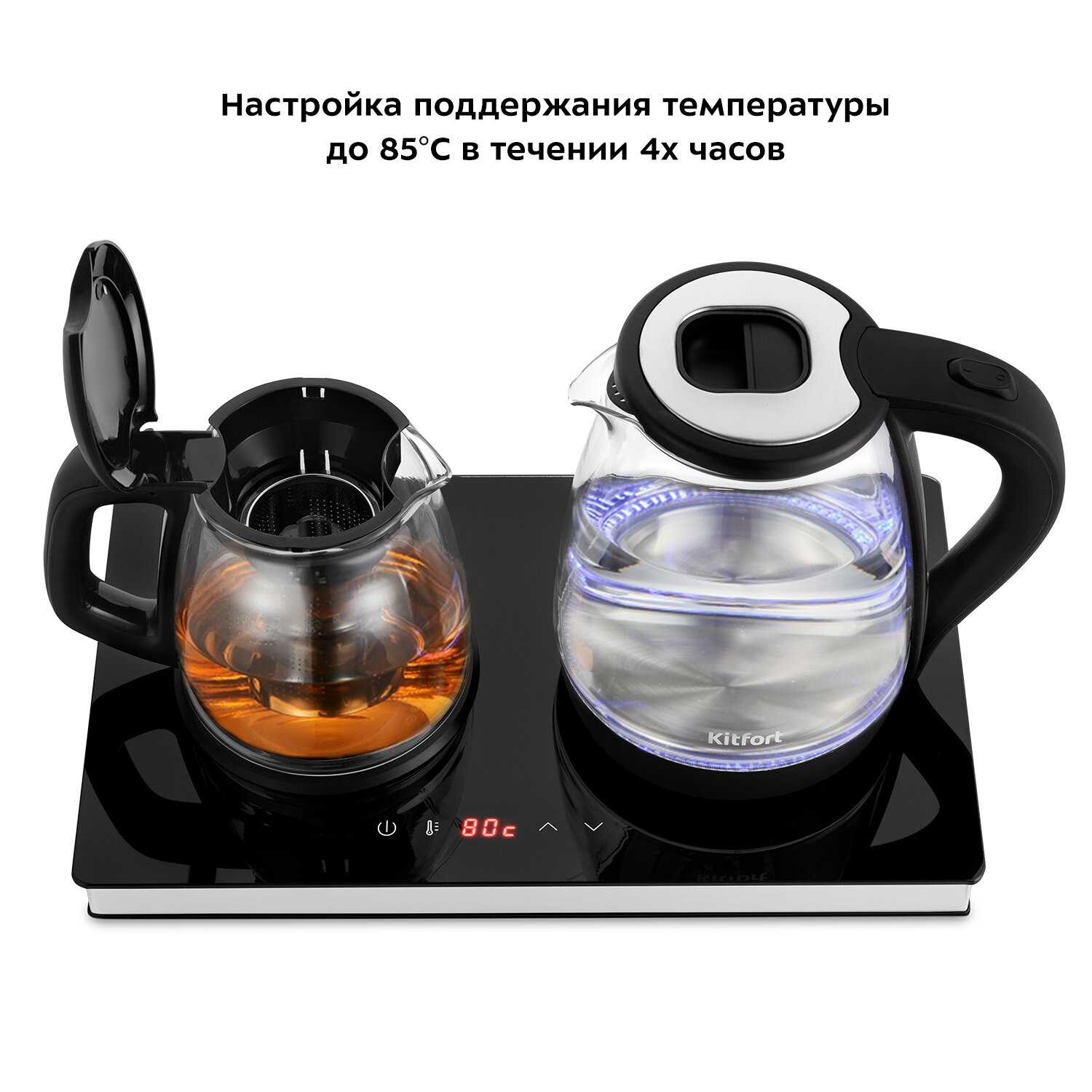 - Функция поддержания температуры в заварочном чайнике с регулируемыми режимами (70–85°C):