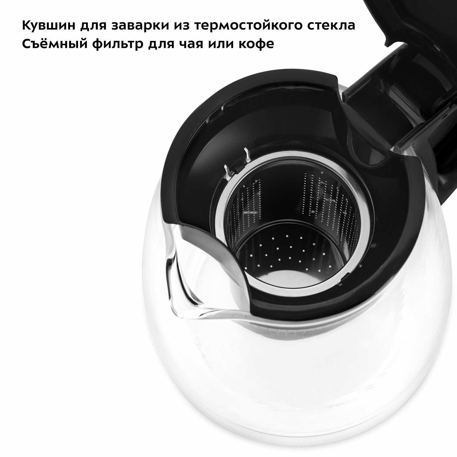 - Съёмная крышка основного чайника (угол открытия 60°) упрощает наполнение.