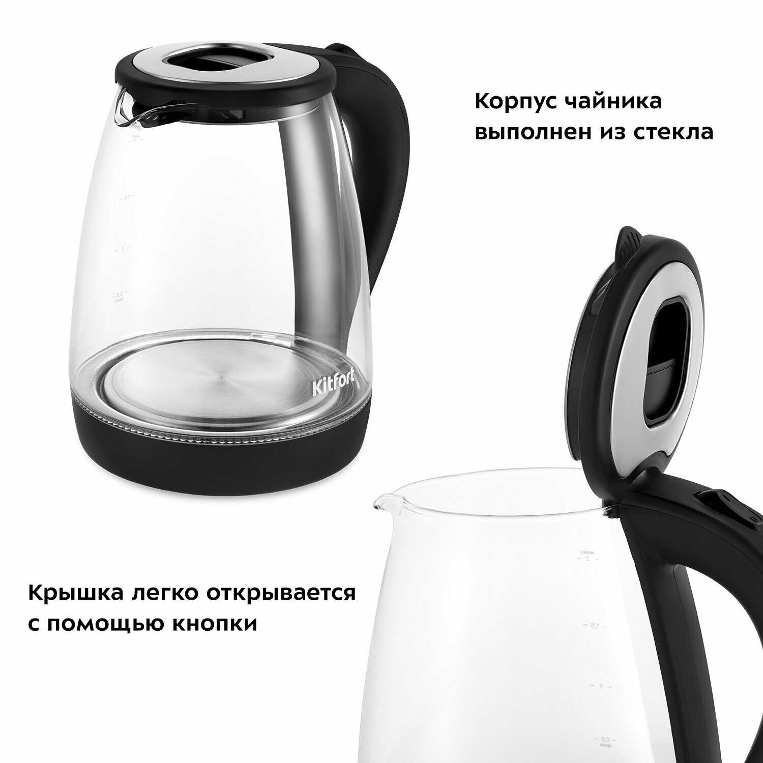 - Стеклянный корпус заварочного чайника демонстрирует процесс заваривания.