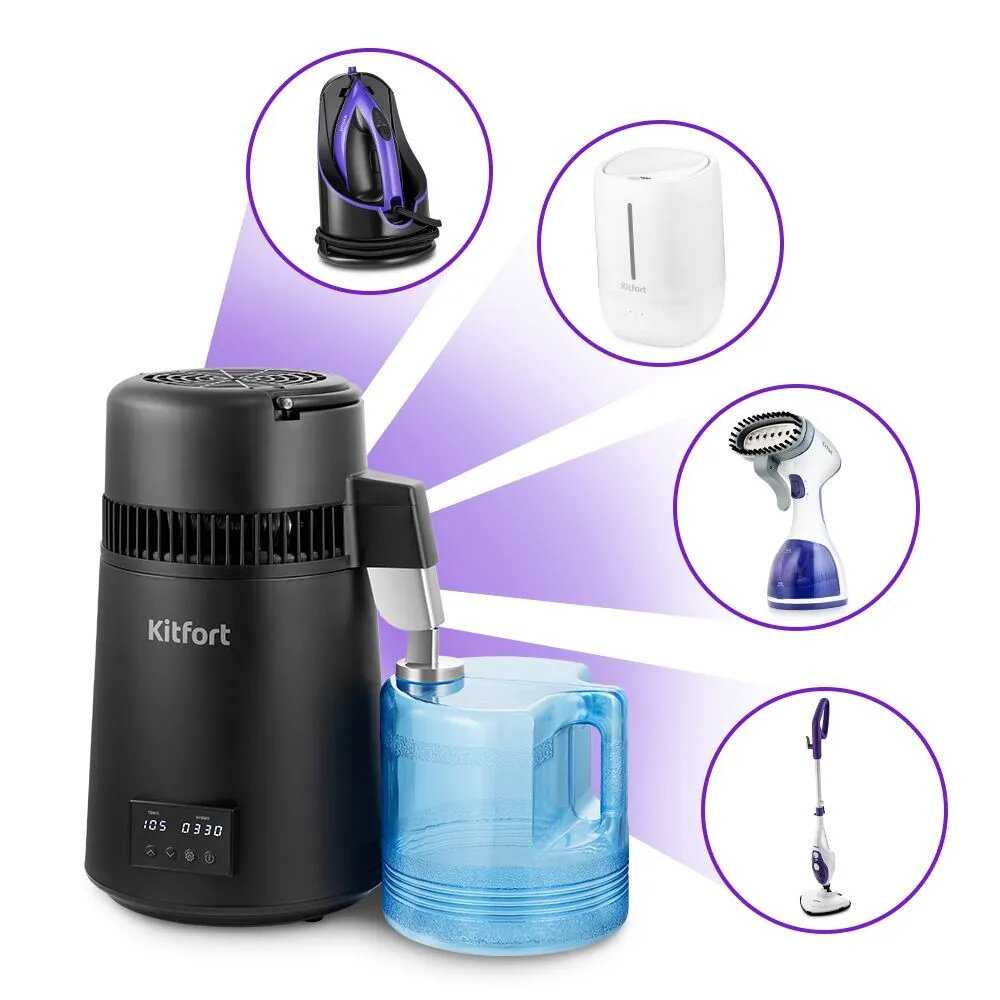 - + Высокое качество дистиллированной воды, бесшумная работа и простота использования. Устройство идеально подходит для бытовых нужд, таких как заливка в утюги, отпариватели, увлажнители воздуха и паровые швабры.