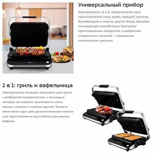 - Три типа панелей (гриль, гладкая поверхность, вафельница) обеспечивают многофункциональность.