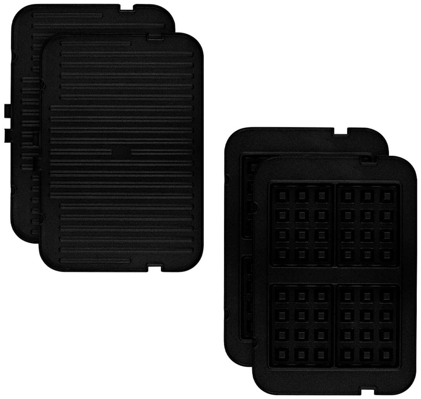 В комплекте три типа панелей: ребристая (для гриля), гладкая (как сковорода) и вафельная. Они фиксируются надежными защелками, а их замена занимает секунды. Панели можно мыть в посудомоечной машине, но пользователи советуют дождаться их полного остывания перед очисткой. -