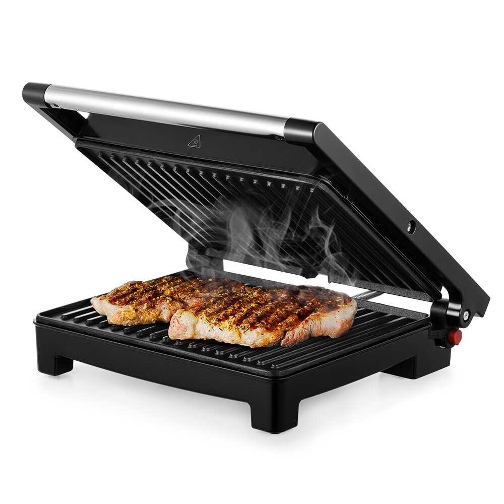 - Возможность открытого (на 180 градусов) и закрытого гриля позволяет готовить как на решетке (овощи, рыба), так и в духовке (сэндвичи, мясо).