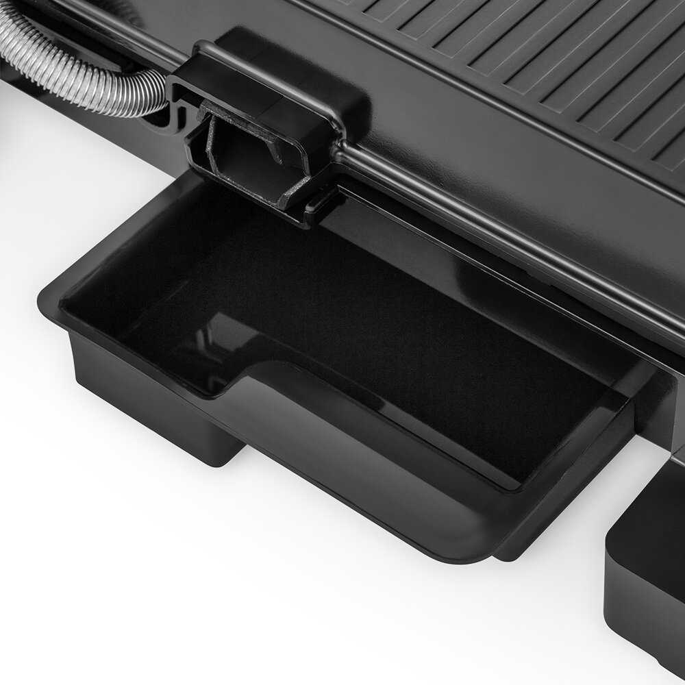 Да, гриль оснащен съемным лотком для сбора жира и жидкости, который легко вынимается и вставляется обратно. Пользователи хвалят это за удобство: лоток предотвращает разбрызгивание и упрощает уборку. В отзывах отмечают, что он эффективно собирает сток от мяса и овощей. Однако в некоторых случаях упоминают, что брызги все равно возможны с боков. -
