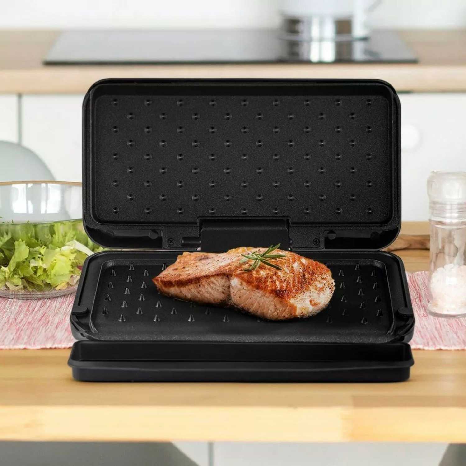 Прибор рассчитан на 1–2 порции: одновременно вмещает два тонких стейка, одну шаурму или 2–3 бутерброда. Идеален для небольших кухонь, студентов или одиночного использования. Для большой семьи его мощности и размера будет недостаточно.