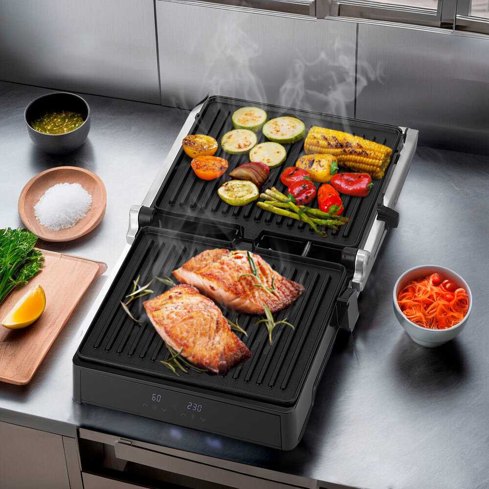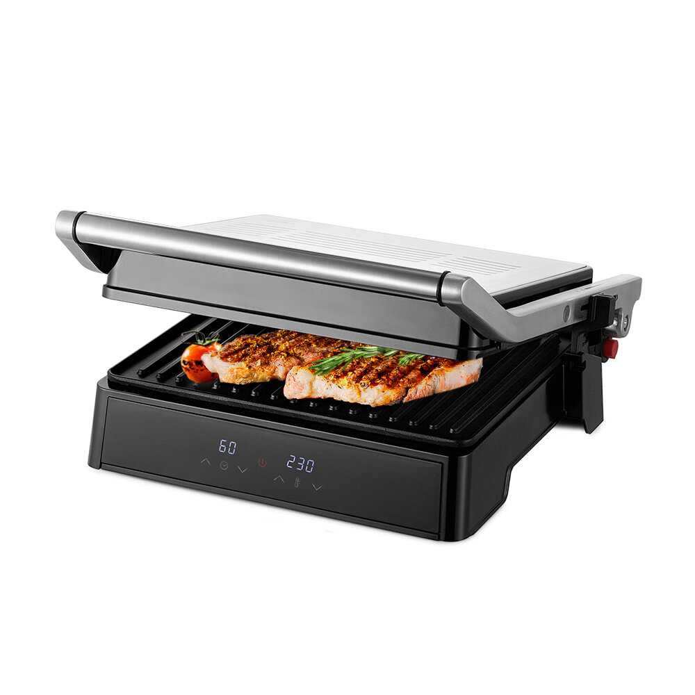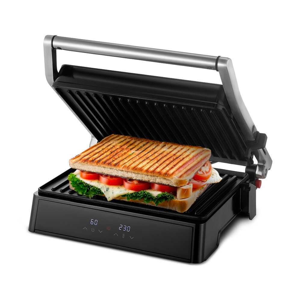 - + Хороший размер гриля, большая площадь панелей, есть возможность разложить гриль на 180 градусов тем самым увеличить площади рабочей поверхности. Сенсорное управление и 2 дисплея это огромный плюс для меня. Выглядит стильно и надежно. Вписался в кухню идеально.
