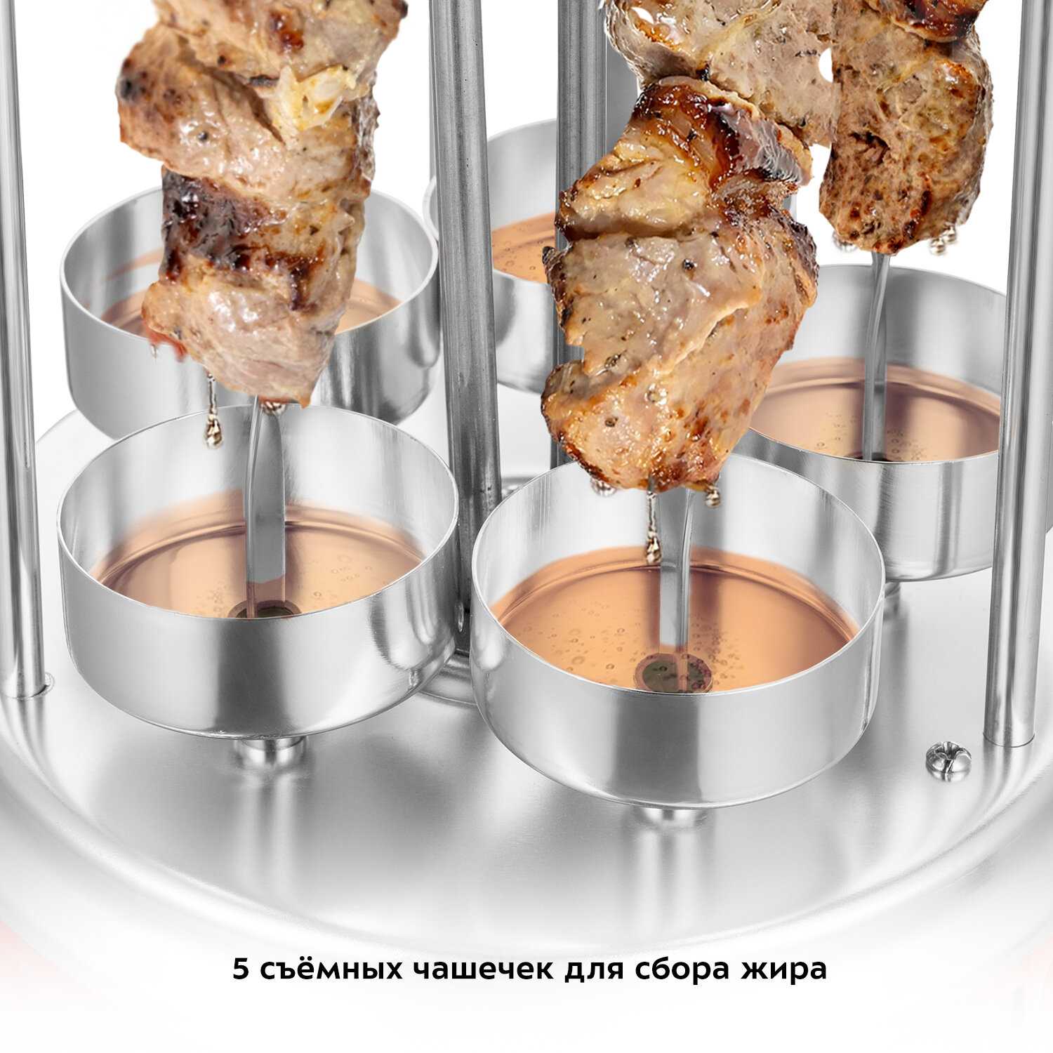 Под каждым шампуром расположены индивидуальные чашечки, которые надежно собирают стекающий жир и сок. Пользователи отмечают, что чашки не протекают, а их конструкция предотвращает разбрызгивание. Это не только упрощает уход, но и способствует правильному приготовлению, так как мясо не жарится в собственном жиру. -
