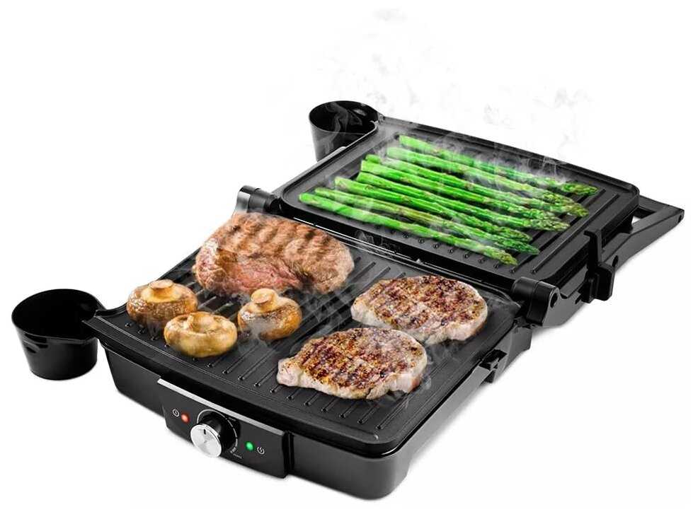 Модель мощностью 2000 Вт обеспечивает быстрый нагрев до 220°C, что позволяет готовить стейки средней прожарки за 6–8 минут. Антипригарное покрытие панелей исключает прилипание даже без масла, а закрытый нагревательный элемент гарантирует равномерное распределение тепла. Регулятор температуры с диапазоном 100–220°C и световым индикатором упрощает контроль готовки. Раскладная конструкция (180°) превращает гриль в две независимые поверхности для одновременного приготовления разных блюд. Однако несъемные панели усложняют чистку: жир часто попадает в труднодоступные зоны, например, на регулятор мощности.