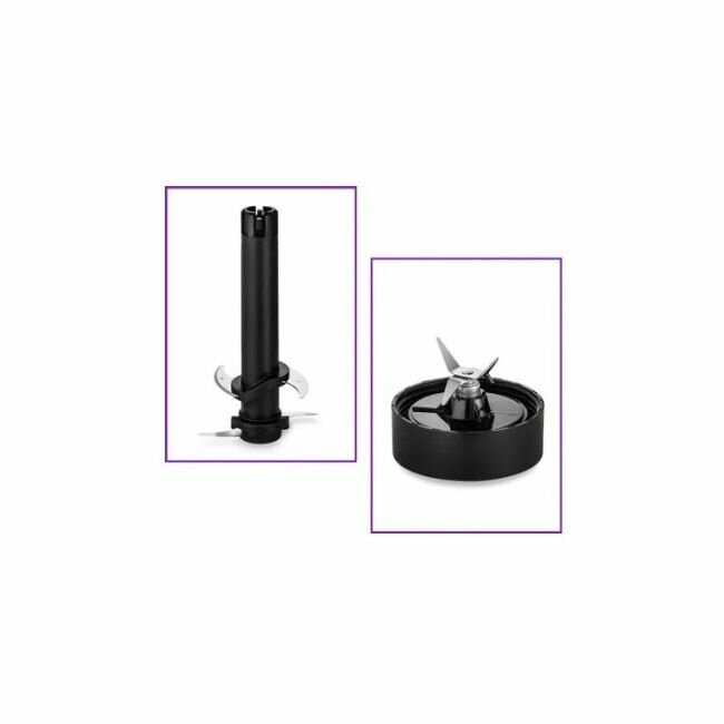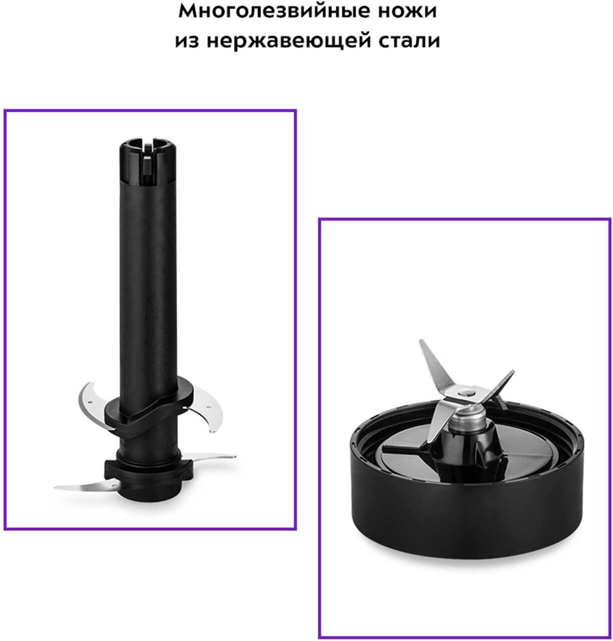 - + Богатая комплектация: два стакана разного объема и крышки "непроливайки" для них, большой кувшин и лезвия. Для использования в домашних условиях вполне достаточно - с лёгкостью перебивает лёд и крупы, из птицы при должном уровне усердства можно получить пастообразный фарш