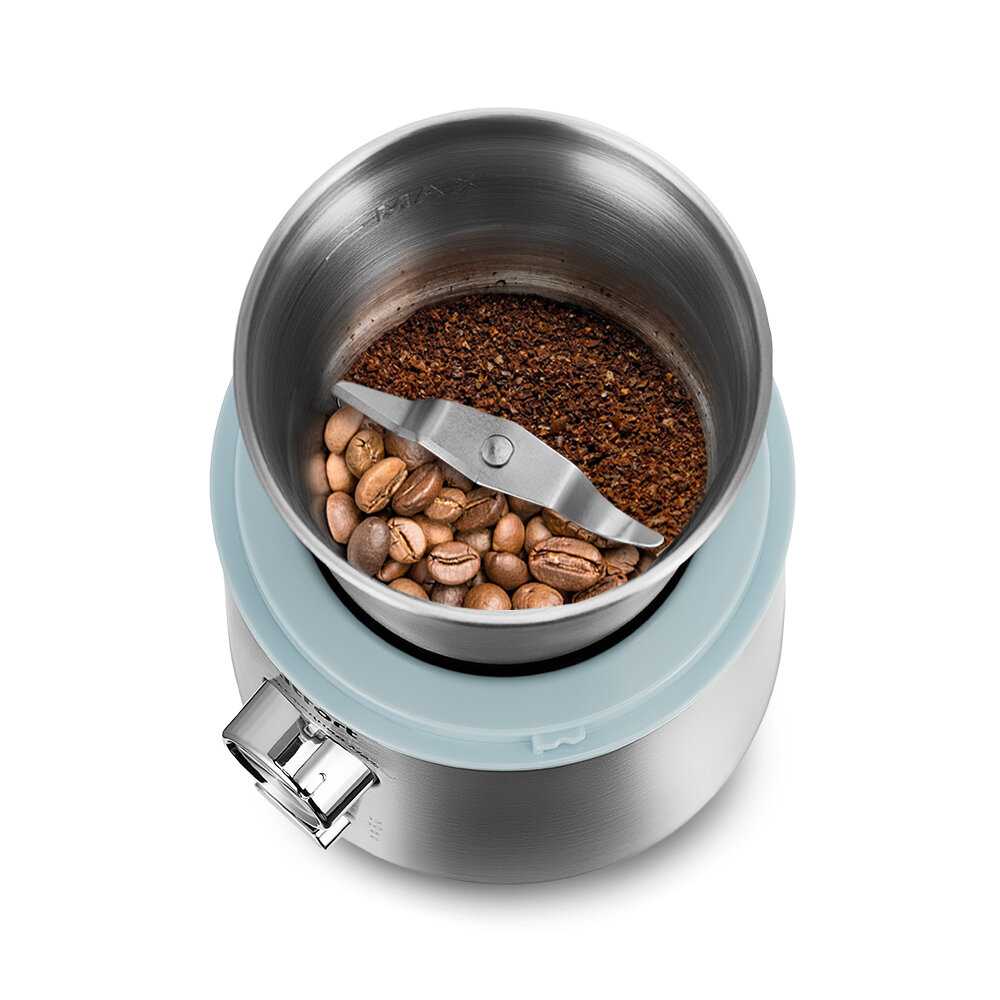 Мощная легко перебила сахар в пудру.Можно выбрать степень помола. Фиксируется кнопка запуска. Защита от не преднамеренного пуска пока не закроешь полностью колбу и не зафиксируешь кнопку кофемолка не запустится. Пригодится в семьях в которых есть дети маленькие. Легко мыть съемный стакан.