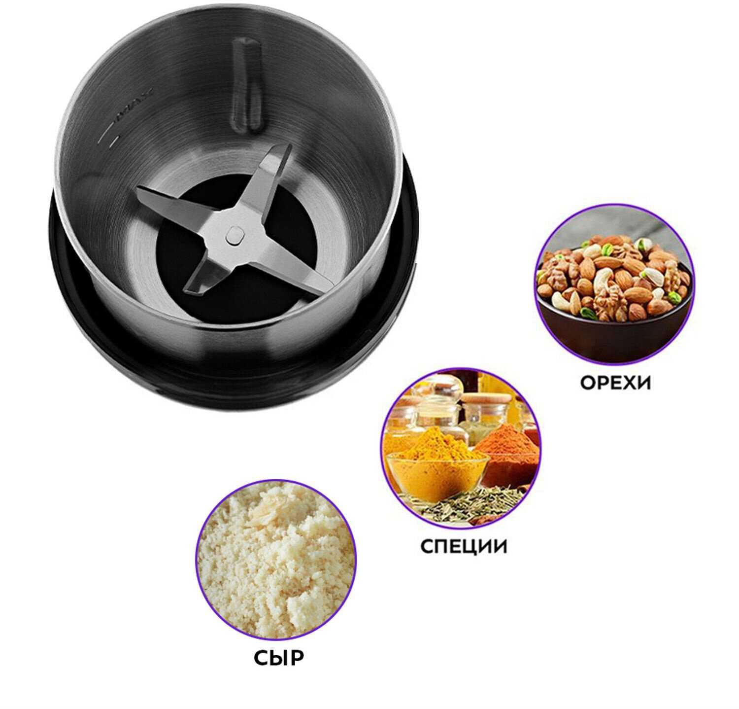 - Металлическая чаша для кофе с 4 лезвиями и отдельная чаша для специй/орехов с 2 лезвиями предотвращают смешивание запахов.