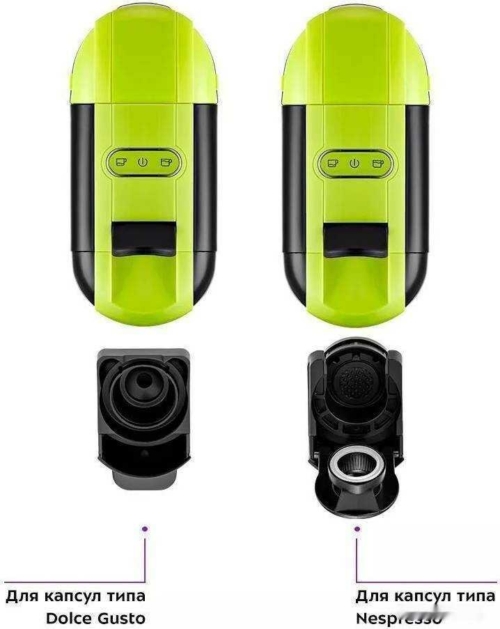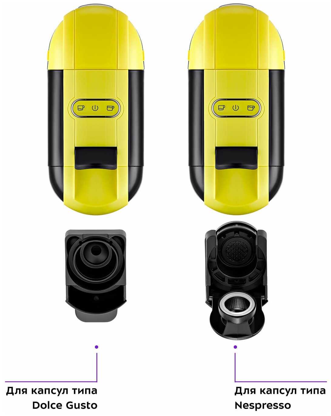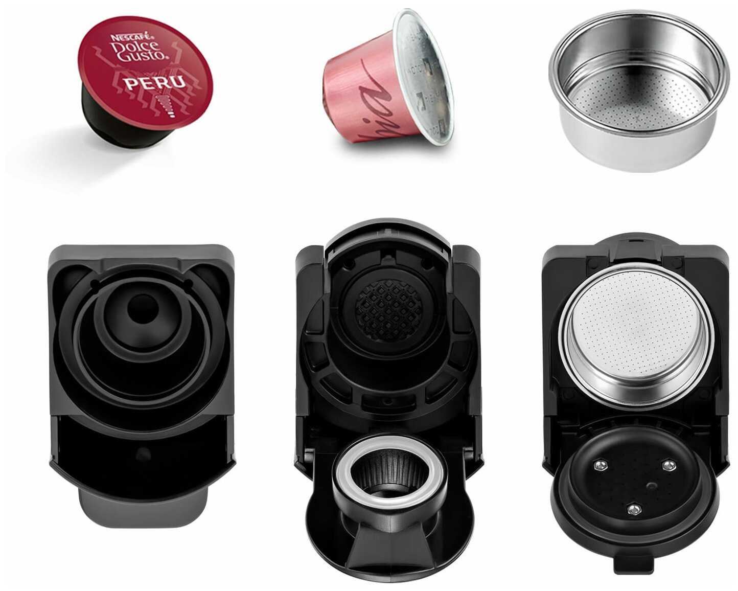 - Универсальность с тремя адаптерами (Nespresso, Dolce Gusto, молотый кофе):