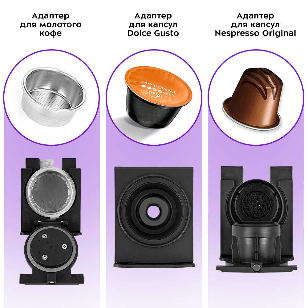 - В комплекте три адаптера: для капсул Dolce Gusto, Nespresso и молотого кофе, что расширяет выбор напитков.