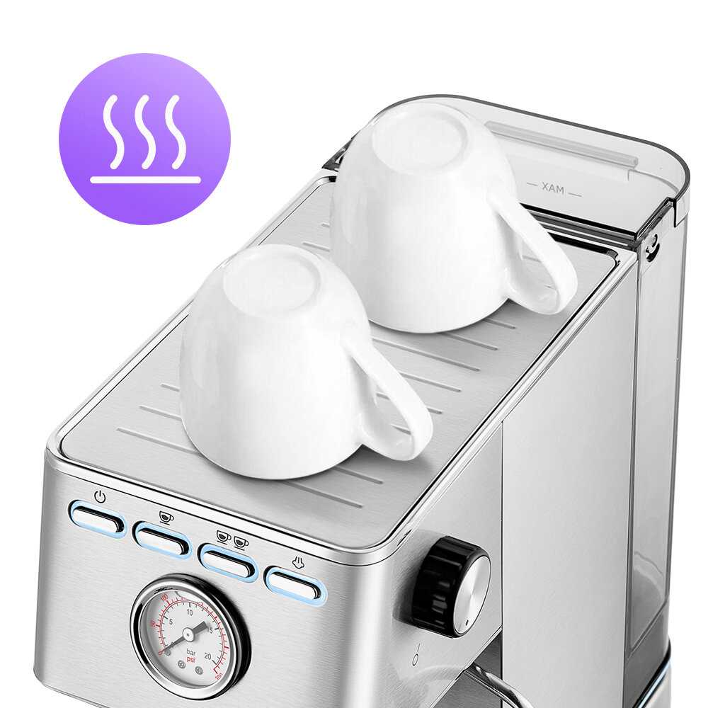 Аппарат выходит на рабочую температуру (90–100°C) за 30–60 секунд, что позволяет готовить кофе без долгого ожидания. При переключении между режимами (например, с варки кофе на пар) может потребоваться дополнительное время на перестройку температуры. Верхняя платформа подогревается, что удобно для предварительного нагрева чашек. -